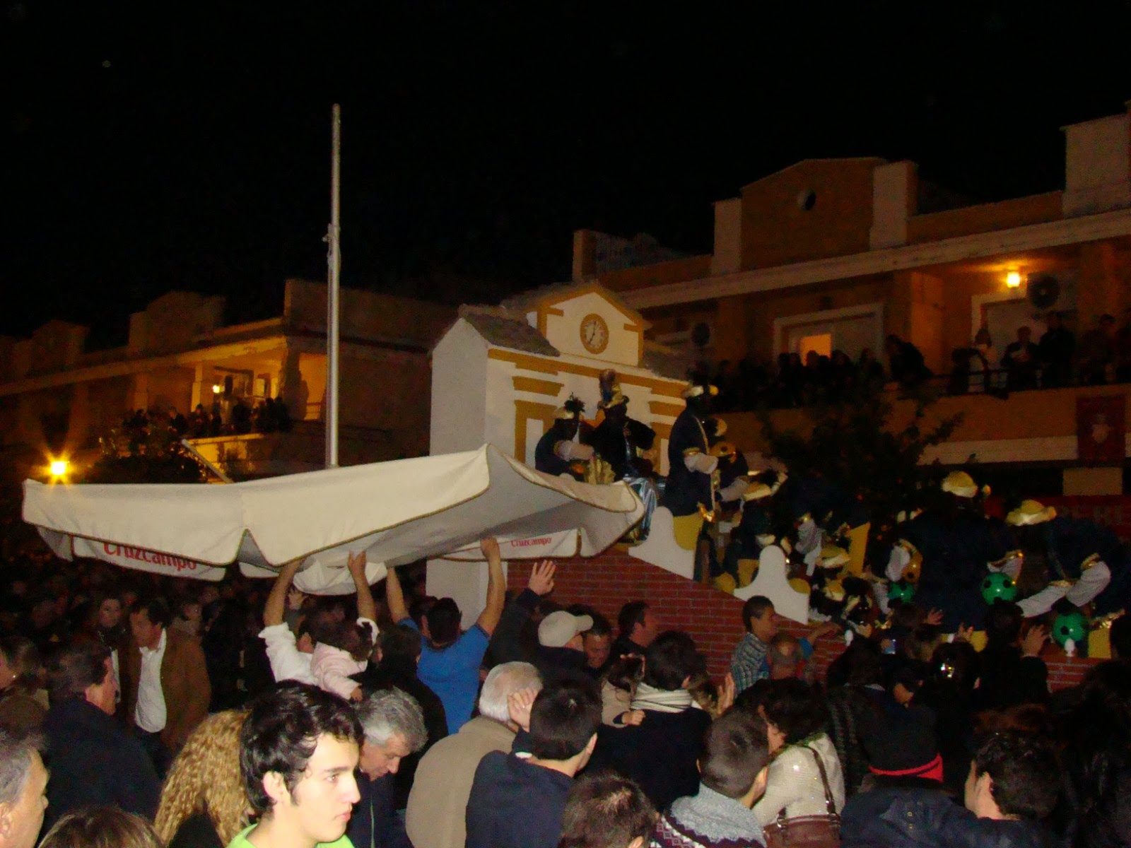 Todos alguna vez hemos visto como los paraguas son utilizados como instrumento para poder recoger caramelos de las cabalgatas con mayor facilidad y abundancia. Lo que no es tan normal es que se utilicen sombrillas de considerable tamaño más que nada por la incomodidad, pero no hay dificultad que un buen grupo de personas en armonía pueda superar.