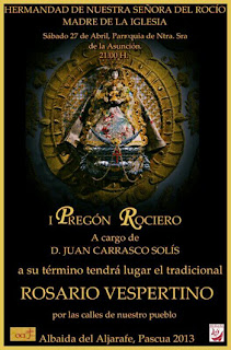 Mañana sábado 27 de Abril del 2013 I Pregón Rociero de la Hermandad de Albaida del Aljarafe en la Parroquia de Nuestra Señora de la Asunción a cargo de D. Juan Carrasco Solís Licenciado en derecho y pregonero de las Hermandades de Umbrete, Córdoba, Olivares, Carrión de los Céspedes entre otras y el último fue el celebrado el año pasado en la Hermandad de Carmona. Desde Blogmorado le deseamos al pregonero y amigo del Blog mucha suerte.
