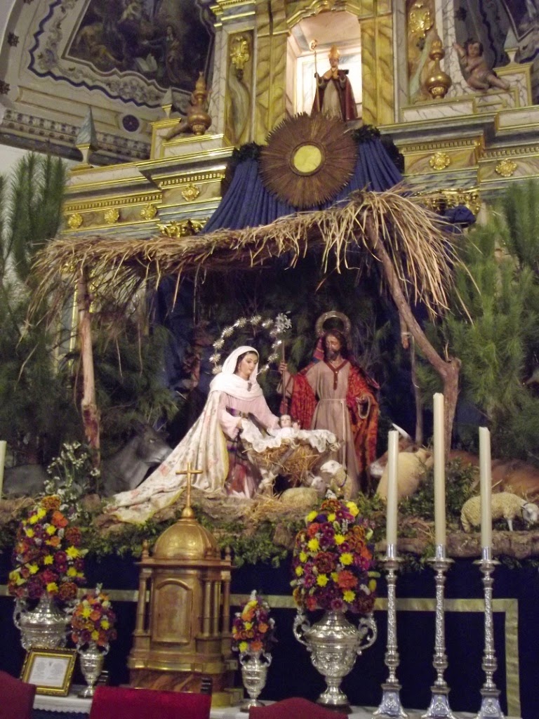 Esta tradición, antiguamente engrandecida con un gran altar en el presbiterio fue decayendo hasta casi desaparecer, pero felizmente en los últimos años han vuelto a recuperar su esplendor perdido y este año se han recreado dos escenas con la Virgen y su Esposo. En la primera aparecían caminando hacia Belén y en la segunda la escena del Nacimiento que es la que les mostramos en este reportaje.