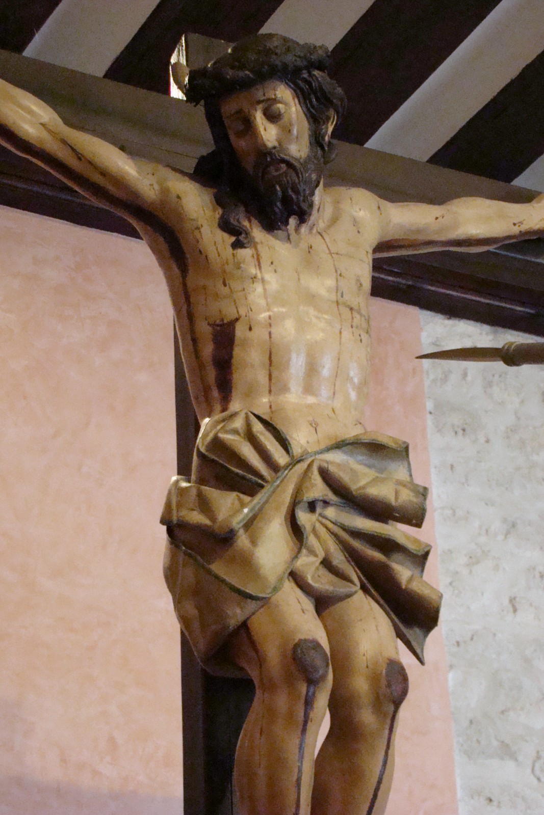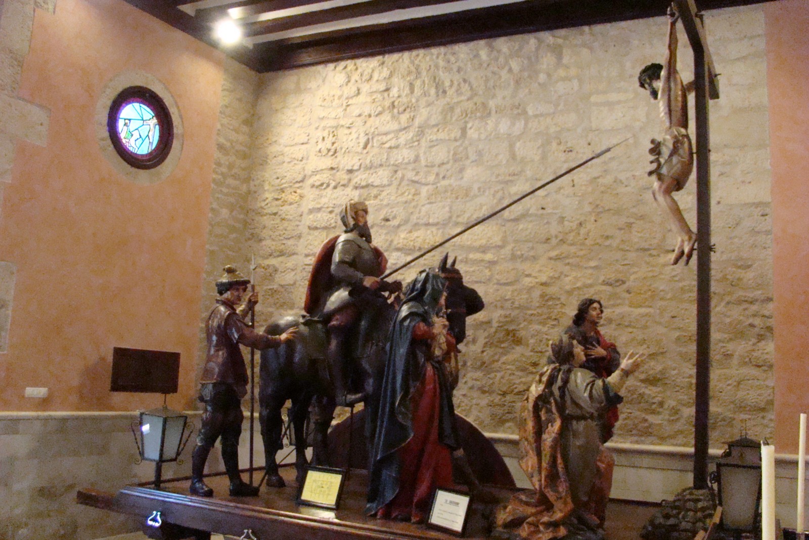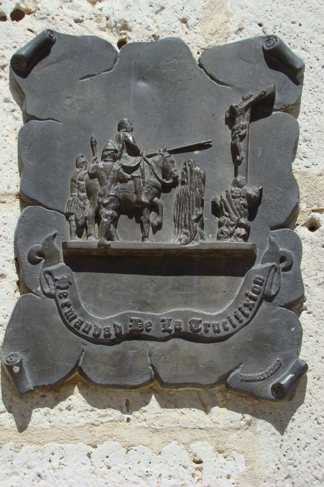 » El paso de la Crucifixión es obra del escultor Tomás Sierra, realizado en el año 1694, muestra la particularidad de que las figuras secundarias de los sayones y el longinos van ataviados con las vestiduras propias del siglo XVII, además incorpora la figura del caballo hecho novedoso en aquellos tiempos.»