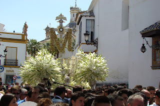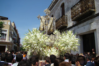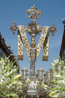 » En la mañana del segundo domingo de mayo procesiona por las calles de La Palma del Condado la Cruz de la calle Sevilla. Todo el conjunto del paso es una destacada obra de orfebrería de Manuel Seco Velasco realizada en 1948 en plata de ley, según diseño de Santiago Martinez. A las diez de la mañana sale de su capilla hacia la iglesia parroquial de San Juan Bautista para después de la misa solemne iniciar el camino de regreso a su sede en medio de la veneración de sus devotos «piomperos», este es el apodo por el que se conocen en la localidad. El acompañamiento musical corrió a cargo de la Banda de Nª Sª del Sol de Sevilla y la Banda de Nª Sª del Carmen de Salteras.»