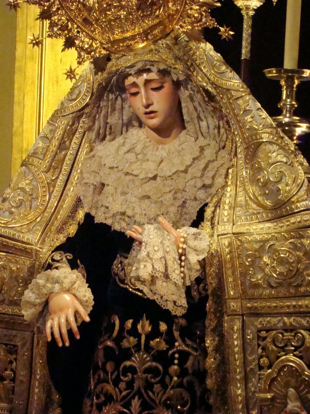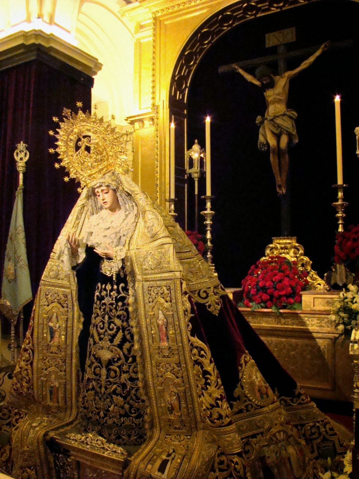 En Sevilla es costumbre realizar altares singulares para los diferentes cultos ya sean triduos, quinarios o novenas de las distintas hermandades y cofradías. También es destacable cuando se realizan los besamanos y besapiés de las imágenes titulares que se busque algo diferente. Aquí lo que llama la atención es justo lo contrario, entre el altar del triduo de María Santísima de la Angustia de la Hermandad de los Estudiantes de Sevilla y su besamanos podemos decir que la única diferencia entre ambos se encuentra en las manos de la Virgen. La mano derecha ha cambiado la postura para ser besada y el pañuelo de la virgen ha cambiado a la mano izquierda.