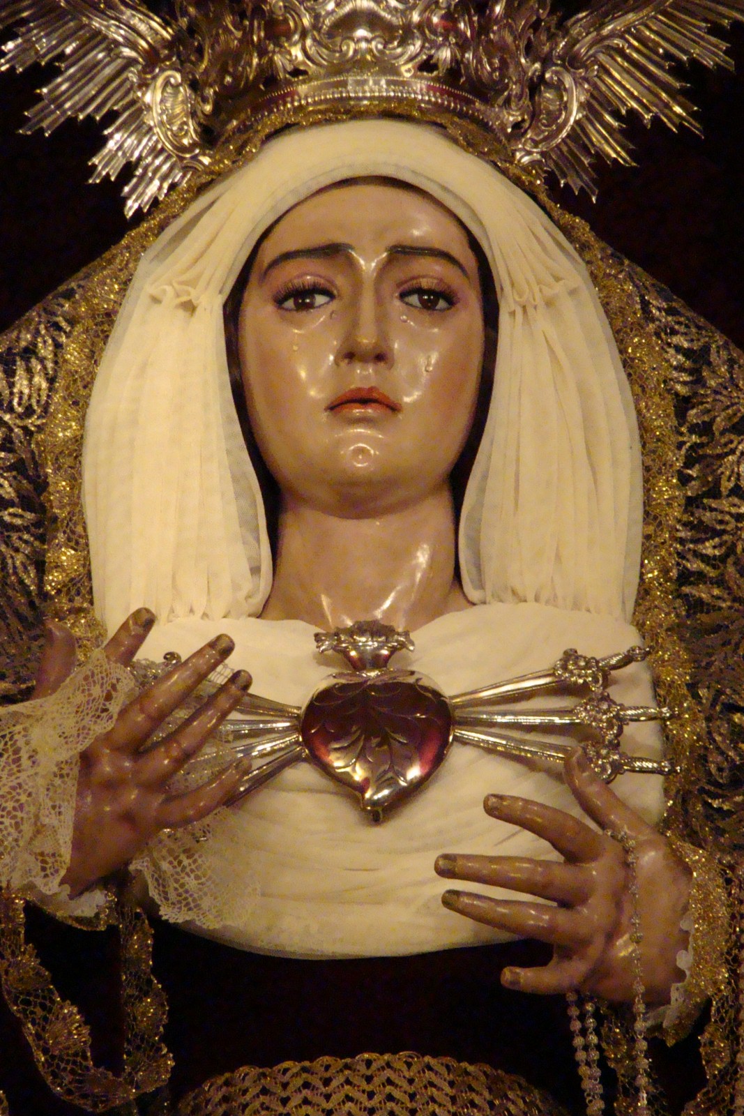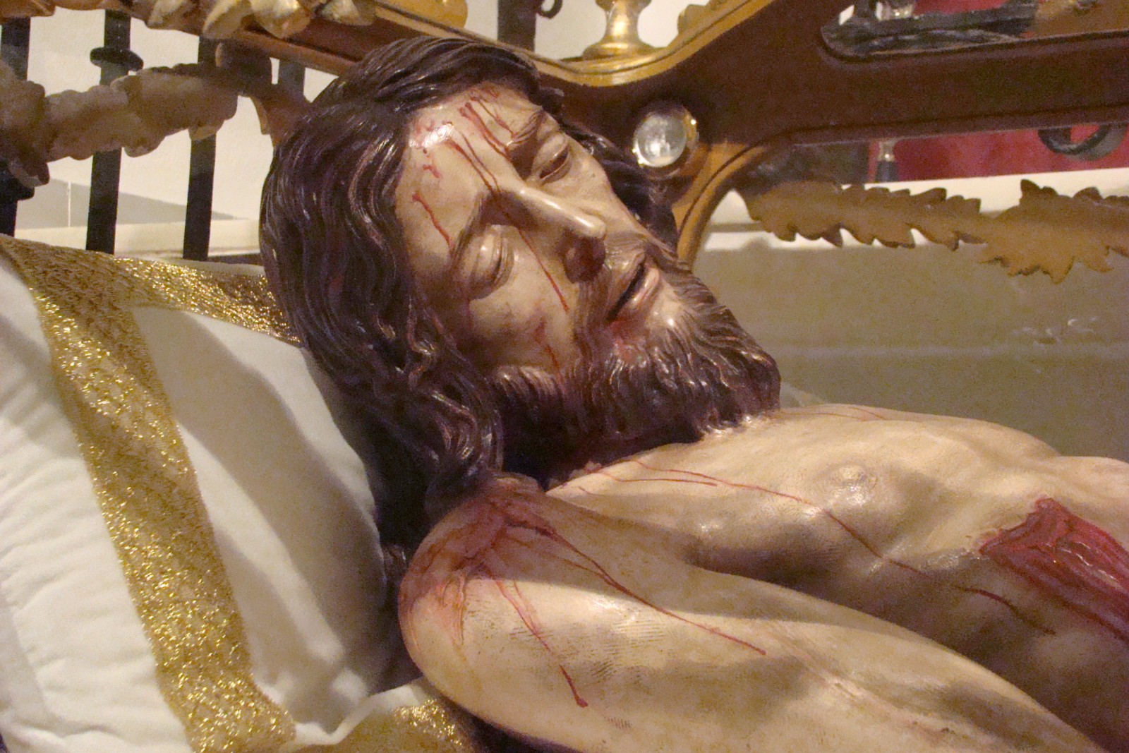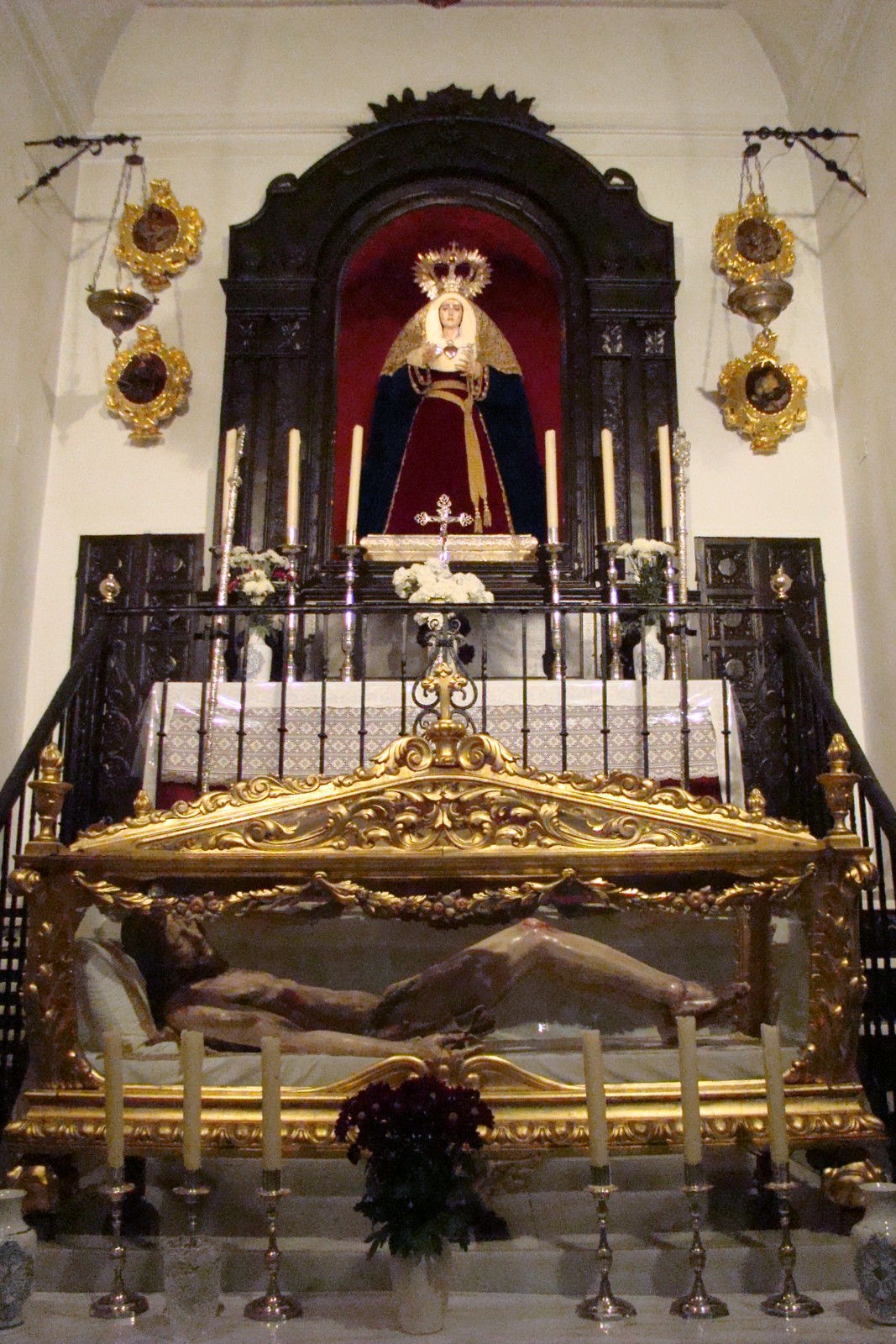 » En la iglesia del Convento de la Candelaria de la localidad de Puebla de Cazalla, tiene su capilla la Hermandad del Santísimo Cristo de Las Aguas y María Santísima de los Dolores, el cristo yacente realizado por Antonio Castillo Lastrucci en 1949 fué remodelado profundamente por Luis Ortega Brú en 1978 por lo que se puede afirmar que es obra de este último escultor. La imagen de la Virgen es obra documentada de José Montes de Oca.»