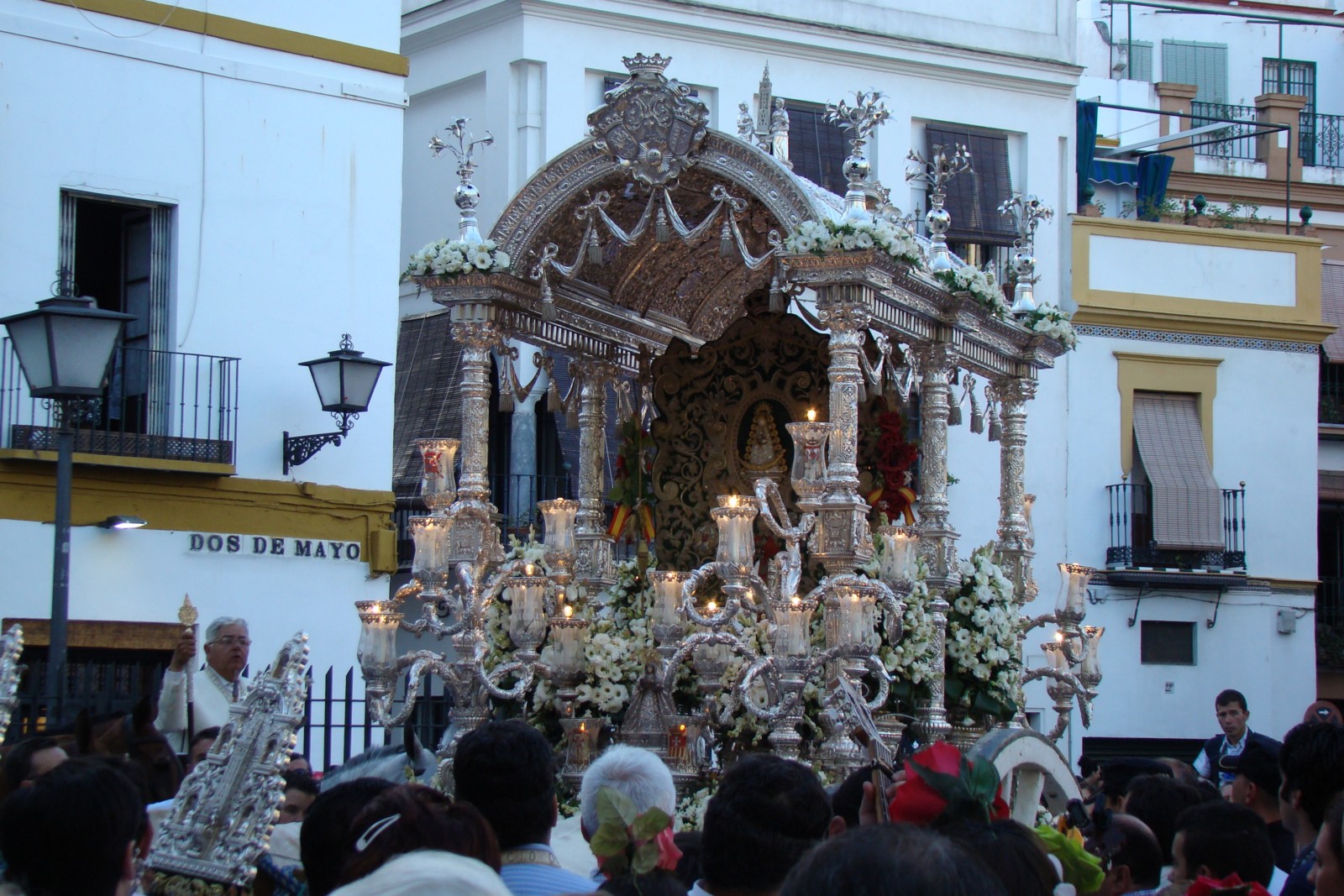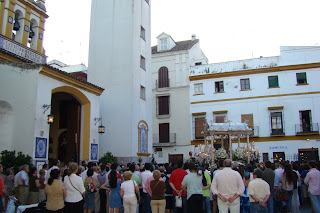» Un año más la Hermandad del Rocio de Sevilla en su camino de regreso de la ermita almonteña visitó la Capilla de la Hermandad de Las Aguas, la junta de gobierno hizo el saludo preceptivo y regaló un ramo de flores, al compás de la salve rociera y el cante por sevillanas».