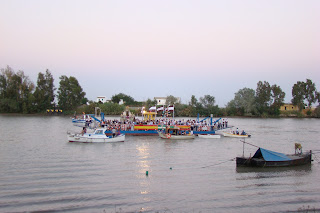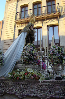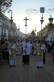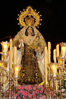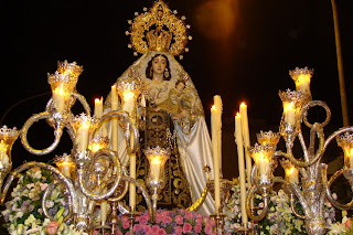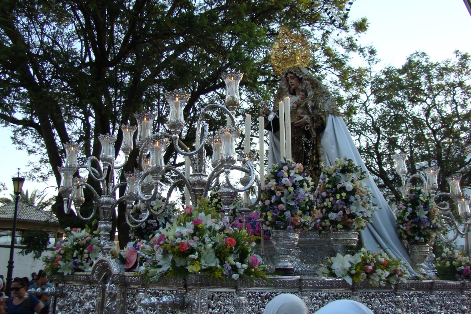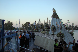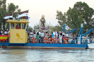 » En la tarde del 16 de julio desde la iglesia parroquial de Nª Sª de la Estrella de Coria del Rio sale en procesión la imagen de Nª Sª del Carmen, titular mariana de la antigua cofradía de marineros , conocida en la actualidad por Hermandad del Gran Poder. La principal singularidad de la procesión es que el paso de la Virgen es conducido al embarcadero del río para desde allí darle un paseo por el mismo en las barcazas que existen en la localidad y que prestan el servicio durante todo el año de cruzar el Guadalquivir. Coria del Río en otros tiempos era un pueblo donde había muchas familias que vivían de la pesca, es precisamente el gremio de pescadores fluviales el que funda la actual Hermandad y de ahí el conservar la tradición de llevar a su patrona hasta las aguas del Guadalquivir, donde todos los años se hace una ofrenda de una corona de flores en recuerdo de todos los fallecidos.Recordar que esta Virgen también sale como dolorosa el miércoles santo en paso de palio.»