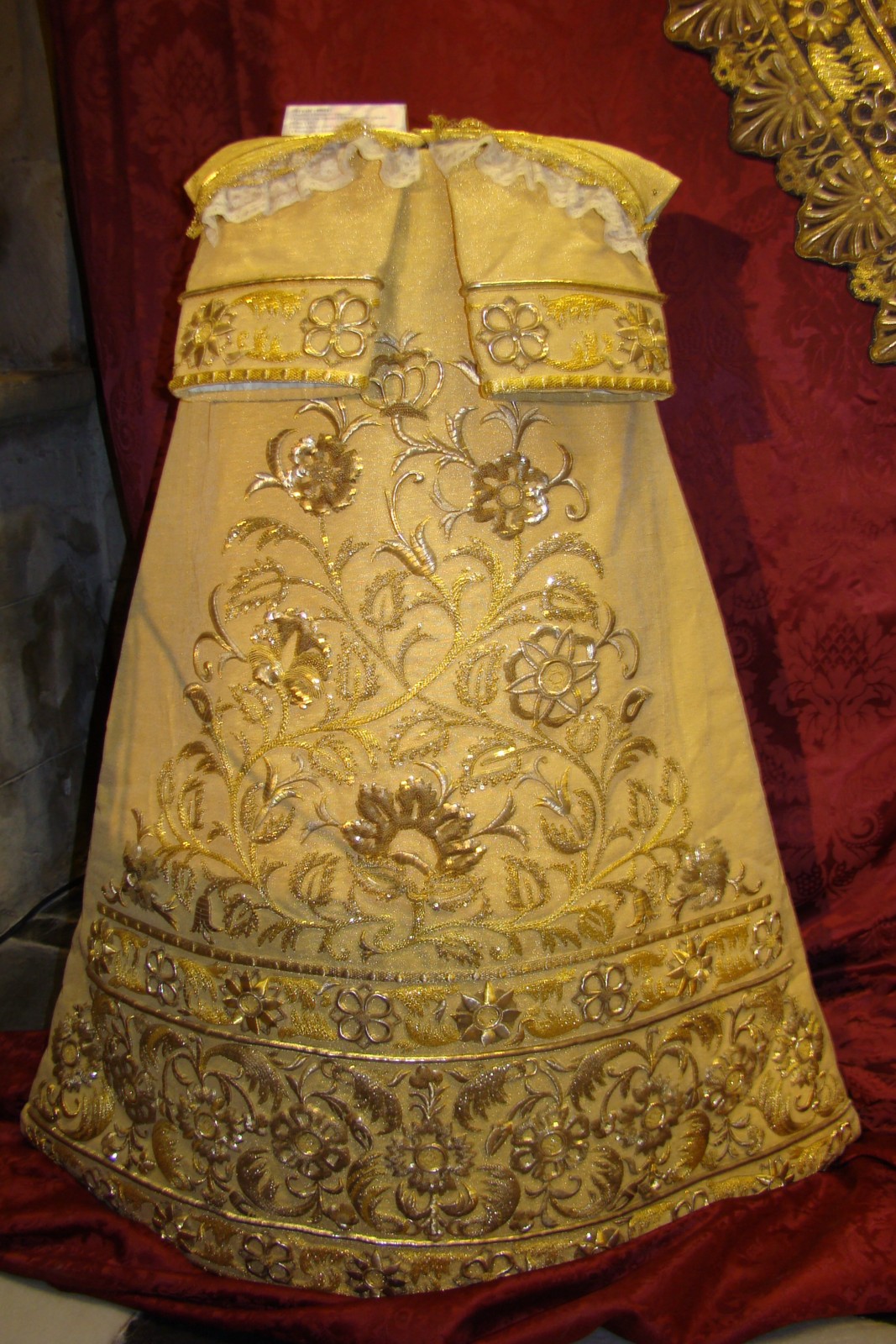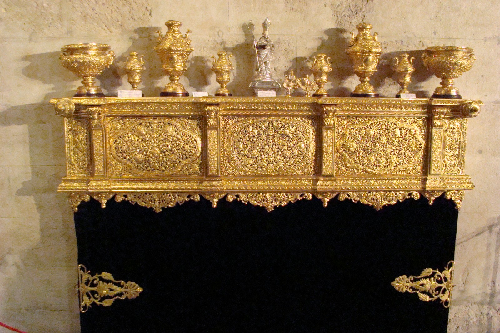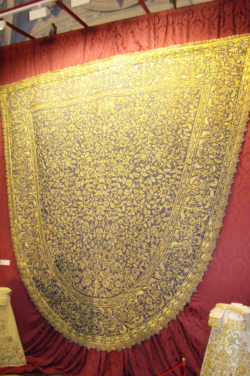 » En el salón apeadero del Ayuntamiento de Sevilla hasta el 10 de marzo permanecerá abierta la exposición «Loreto, la Domus Aúrea restaurada», cuyo principal motivo es mostrar la restauración que ha realizado el taller ecijano de D. Jesús Rosado, del manto de salida de Nª Sª de Loreto, titular de la Hermandad de San Isidoro, obra realizada en 1930 en el Taller de las Hermanas Granado. También se muestra otro de los estrenos para este año, los broches bordados de los faldones, así como otros elementos del paso de palio y enseres del ajuar de la Virgen. Todo el conjunto constituye una destacada «joya» de nuestra Semana Santa.»