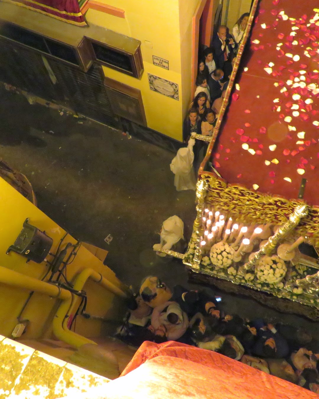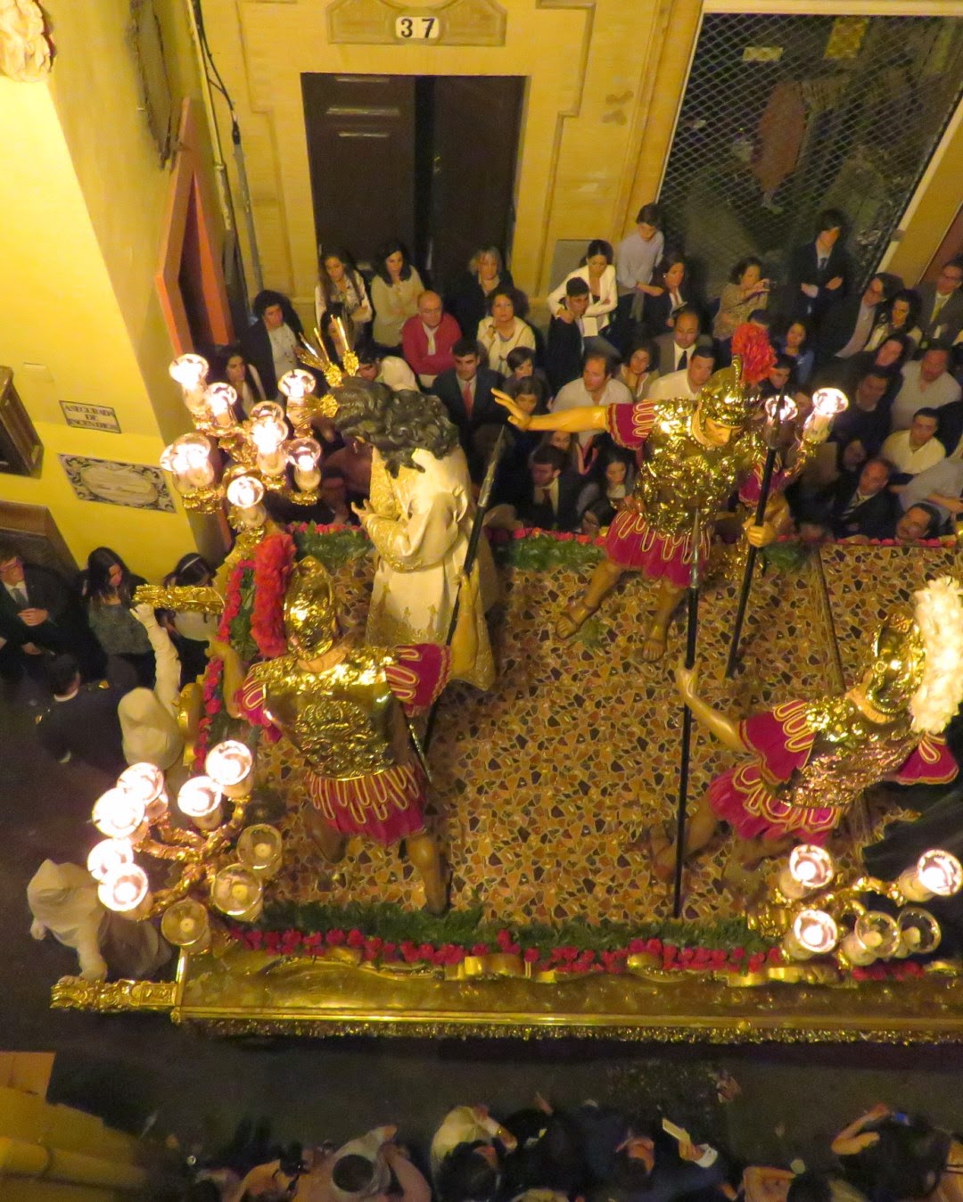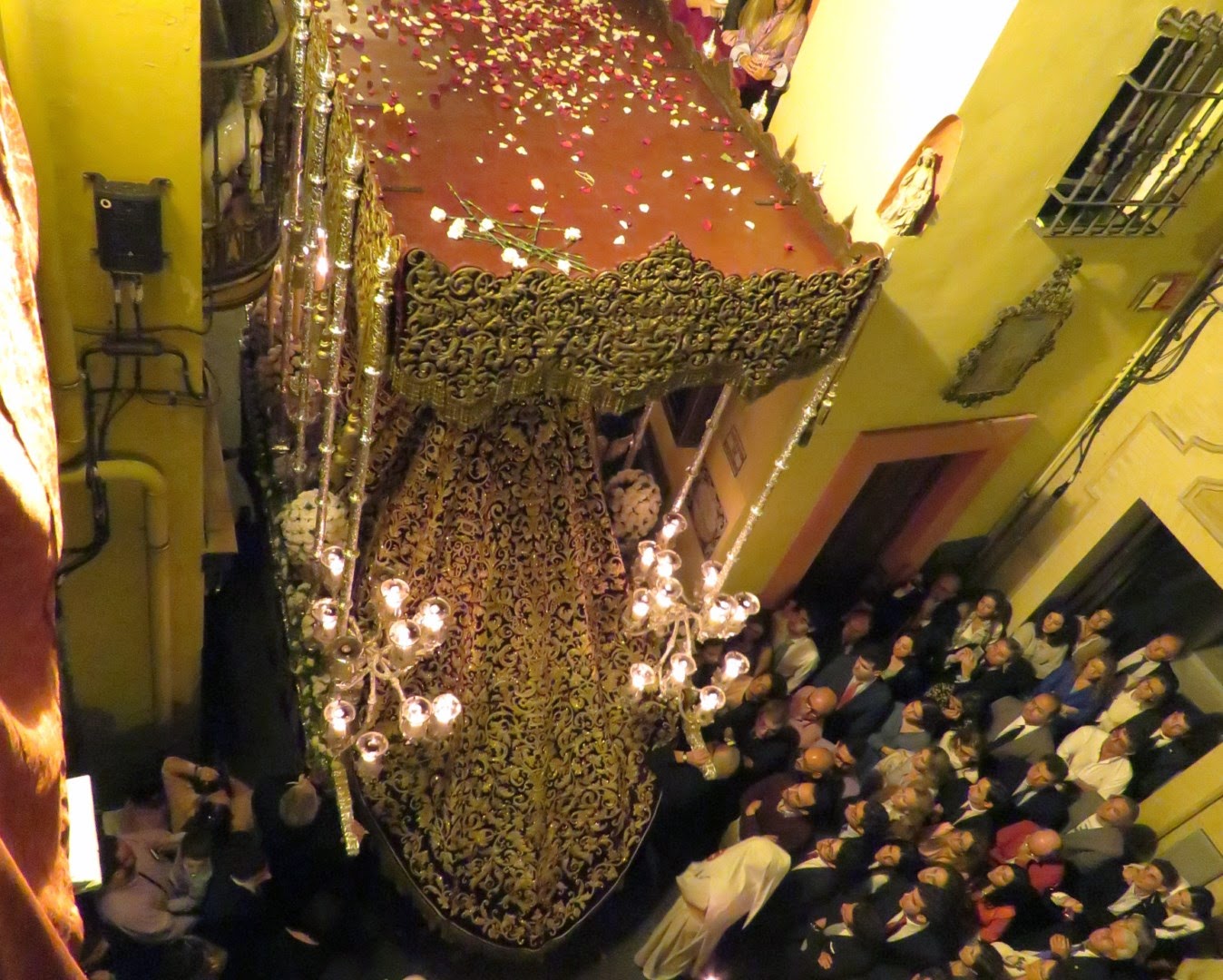 Los sevillanos en su inmensa mayoría vemos el discurrir de nuestras cofradías a pie de calle, solamente unos pocos pueden verla desde los balcones y azoteas. La visión es totalmente diferente, no solamente por el cambio de ángulo visual sino porque se pueden apreciar y ver muchas cosas que desde abajo es imposible su contemplación. Les vamos a mostrar una serie de reportajes de varias cofradías en sus discurrir por las calles sevillanas, en estas entregas en concreto se trata de la céntrica calle Francos. En primer lugar el paso de la Hermandad de la Amargura el Domingo de Ramos.