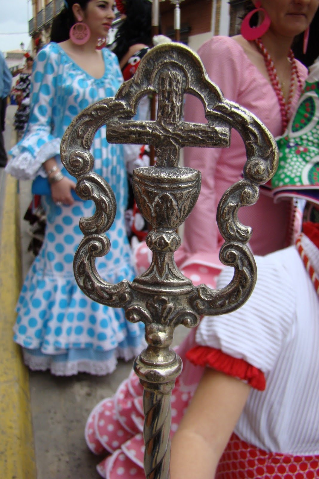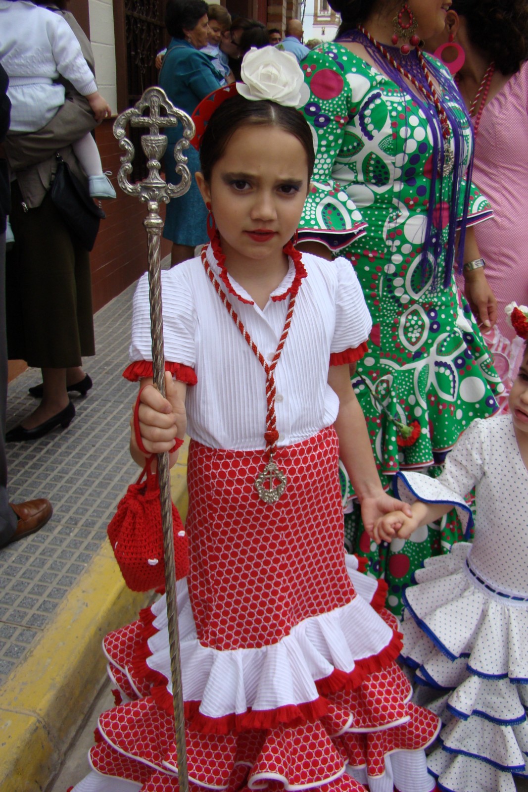 » Una de las cosas que se han perdido con el paso del tiempo en nuestra Hermandad son las varitas que portaban los niños en la estación de penitencia, seria deseable volverlas a recuperar pues los palermitos de plástico aunque sean morados no es lo más estético por decirlo de alguna manera. Viendo las fotos no se piensen que estamos errados, da la casualidad que la varita que porta esa niña de flamenca es idéntica a las que usaba la Hermandad para sus nazarenos infantiles, observese el motivo de la galleta, un cáliz y una cruz,igual que nuestro escudo.»