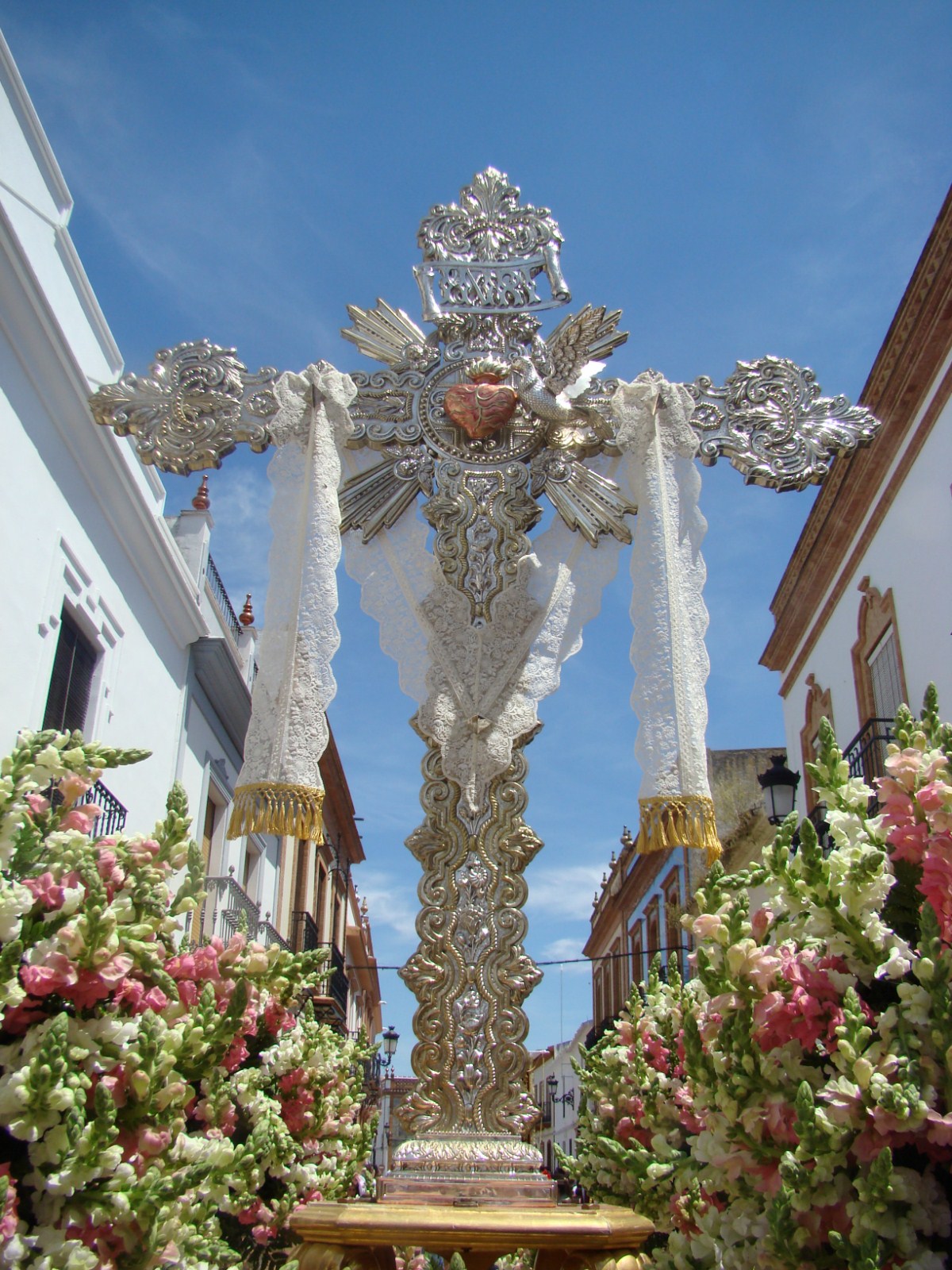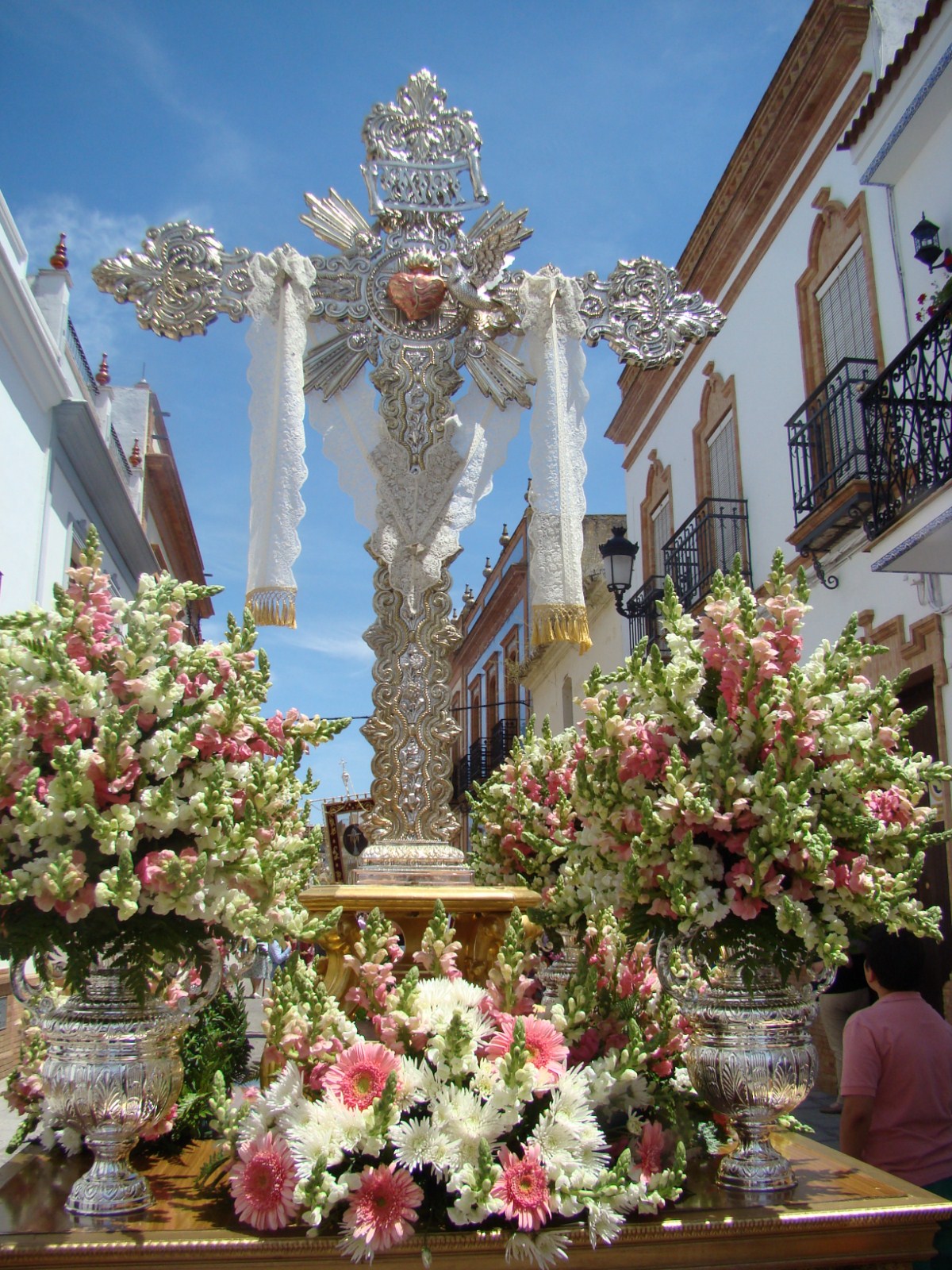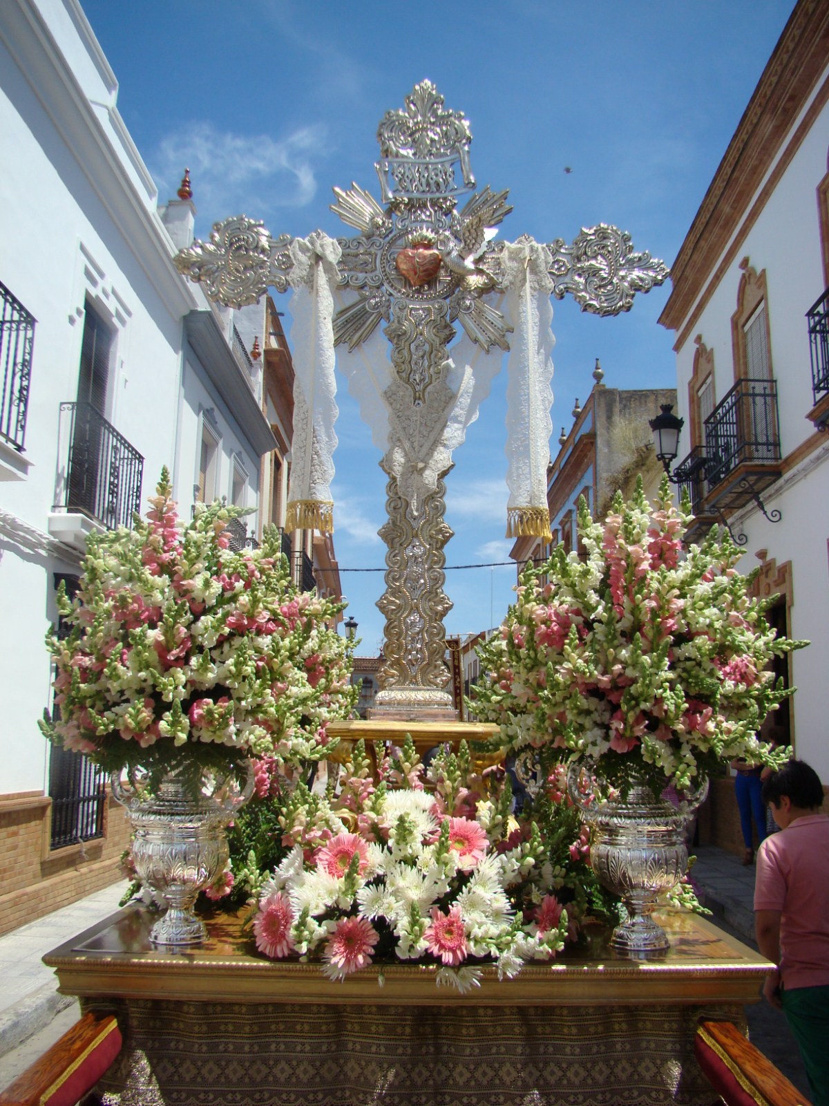 En la localidad onubense de Rociana del Condado, el primer domingo de mayo es el “Día de la Cruz”. Procesionan cinco cruces pertenecientes a diferentes calles de la población, cada una de ellas tiene capilla pero la procesión general se realiza desde la parroquia de San Bartolomé. Les mostramos la que desfila en primer lugar la Cruz de la calle Huerta.