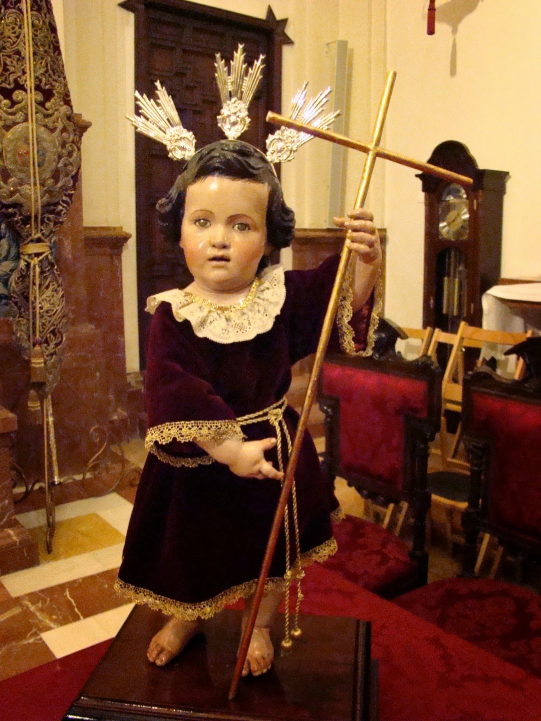 Todas las hermandades de Sevilla poseen una imagen del Niño Jesús, en algunos casos es hasta titular de la propia Hermandad como el caso de la Quinta Angustia donde tiene la advocación del Dulce Nombre de Jesús . Otros incluso procesionan por las calles sevillanas como ocurre con el de la Hermandad del Valle y el anteriormente mencionado en el Corpus de la parroquia de la Magdalena. Pero en la mayoría de ellas tiene otras funciones, como presidir hornacinas, mesas de cabildos o figurar en los altares de insignias vestido con la túnica nazarena. Les vamos a mostrar una amplia selección de los mismos, en esta primera entrega aparecen los correspondientes a las Hermandades del Buen Fin, Cachorro, Calvario, Carretería, Cigarreras y Macarena.
