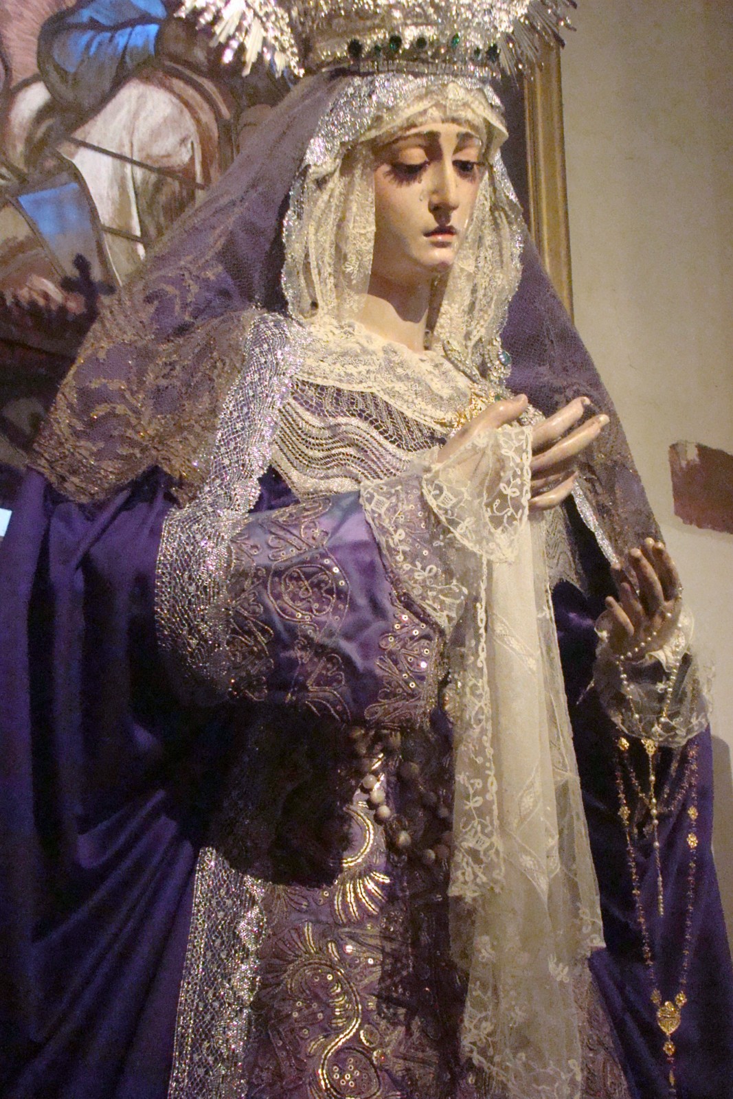 «En estos tiempos de pre-cuaresma se suceden los besapiés,los quinarios y triduos, las exposiciones cofrades, la presentación de carteles, conciertos de bandas , los vía crucis y todo tipo de actos relacionados con nuestra Semana Santa. Entre ellos este pasado fin de semana ha destacado el Besapiés al Cristo de la Oración en el Huerto de la Hermandad de Montesión y junto a él destacaba sobremanera la imagen de Mª Sª del Rosario en sus Misterios Dolorosos Coronada con un atuendo en tonos morados perfectamente conjuntando que nos ha proporcionado una imagen muy bella y poco vista de esta Virgen, gracias a su vestidor Paleteiro. Teniendo este blog por nombre «Morado», está claro que no podia pasar desapercibida.»