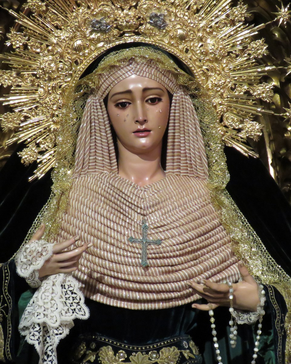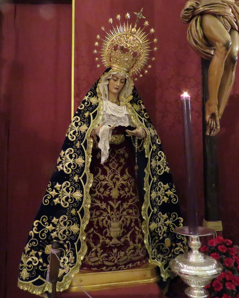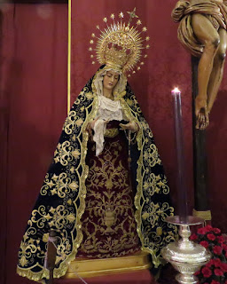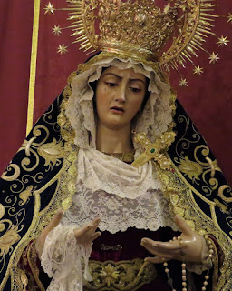Como es costumbre en este blog nos gusta poner de forma periódica los diferentes cambios de vestimenta de nuestras dolorosas titulares, María Santísima de Guadalupe y Nª. Sª. del Mayor Dolor, realizados por nuestro actual vestidor Antonio Bejarano. En estos primeros días de octubre así es como se encuentran nuestras imágenes durante los cultos a Nª. Sª. del Rosario, titular gloriosa de la Hermandad.