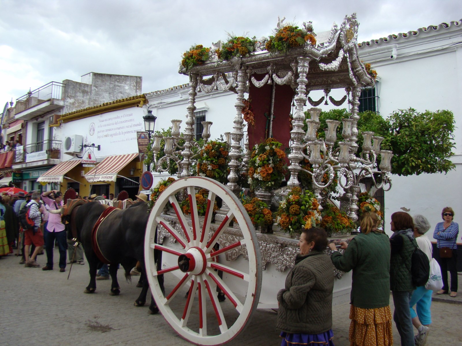 El paso de las Hermandades del Rocío por la localidad sevillana de Villamanrique de la Condesa está declarado “Fiesta de interés turístico nacional de Andalucía”. Les ofrecemos imágenes de las Hermandades de Morón de la Frontera, Tocina y Gines en su transitar por la localidad y en su visita a la iglesia parroquial de Santa María Magdalena donde se produce el saludo a la Hermandad de Villamanrique subiendo la carreta del Simpecado los peldaños de la escalera existente delante de la puerta del templo.