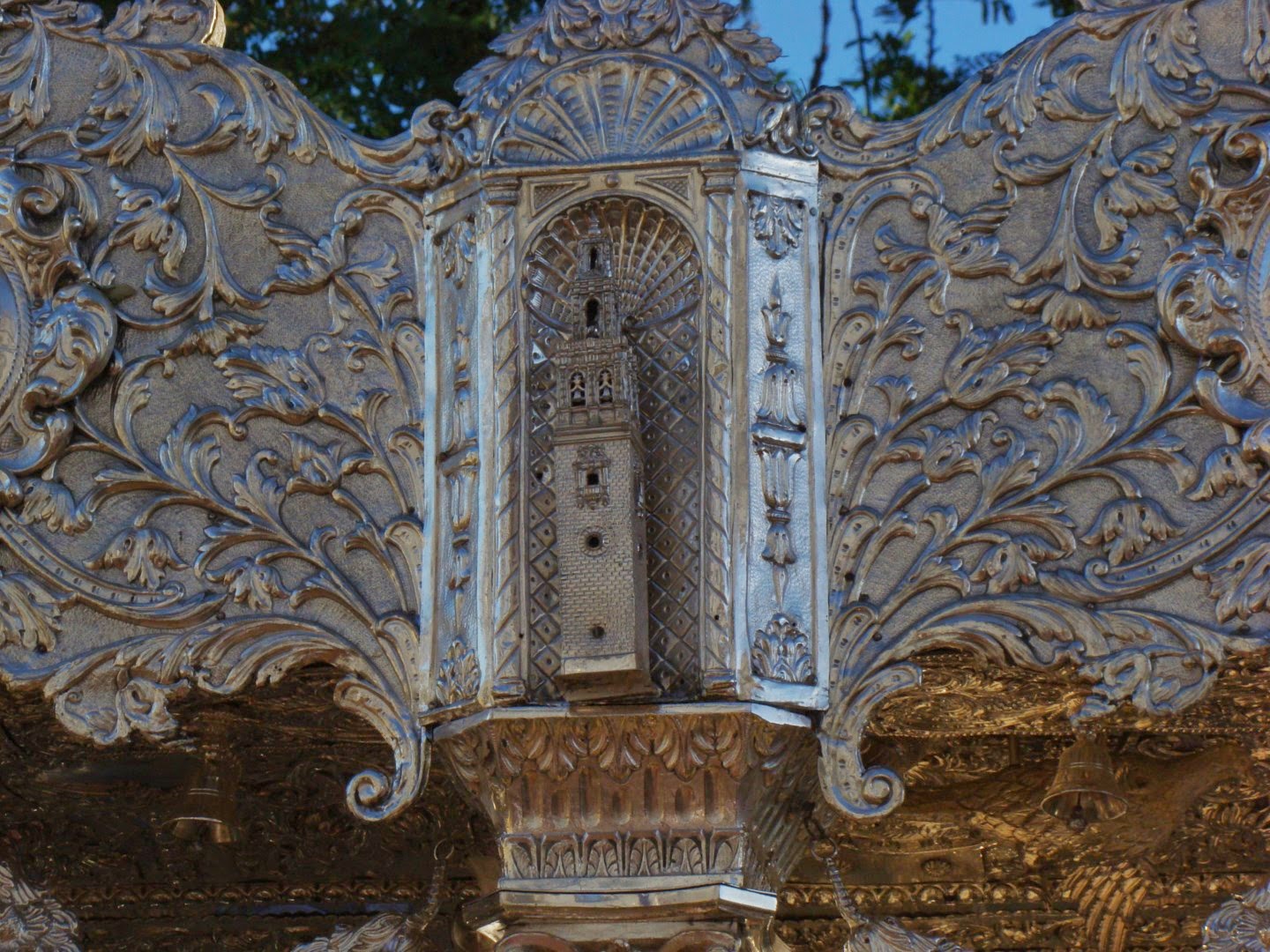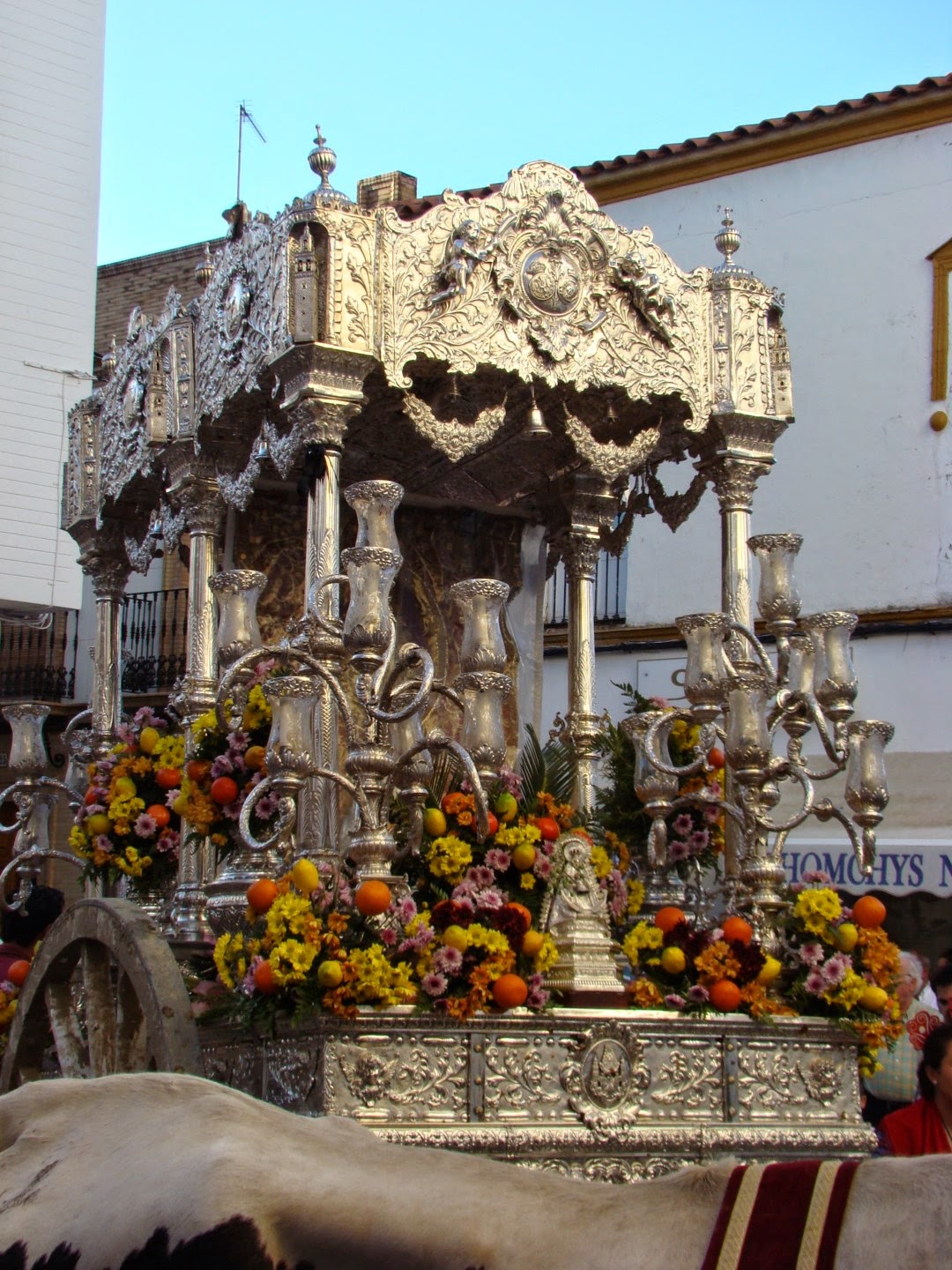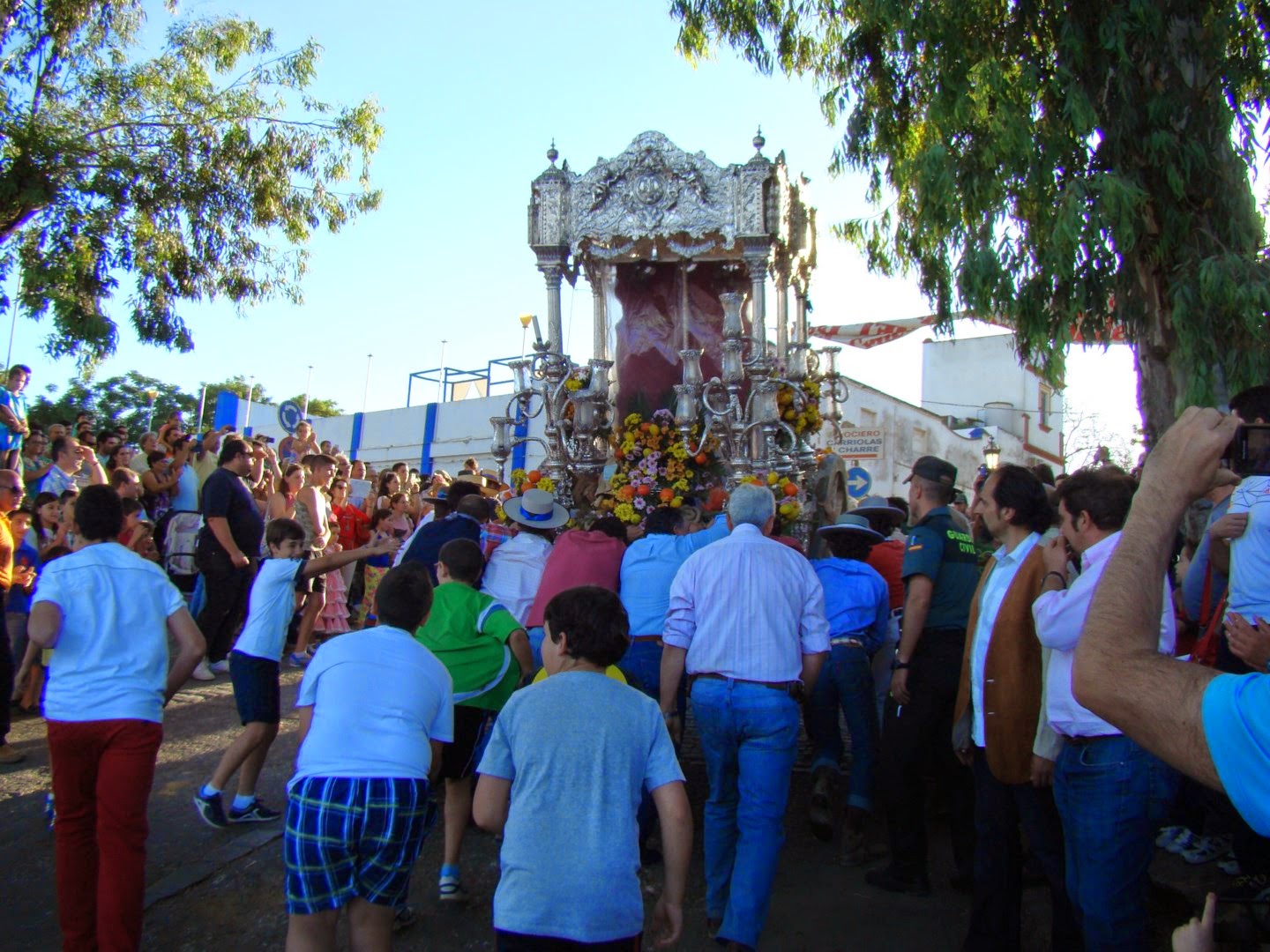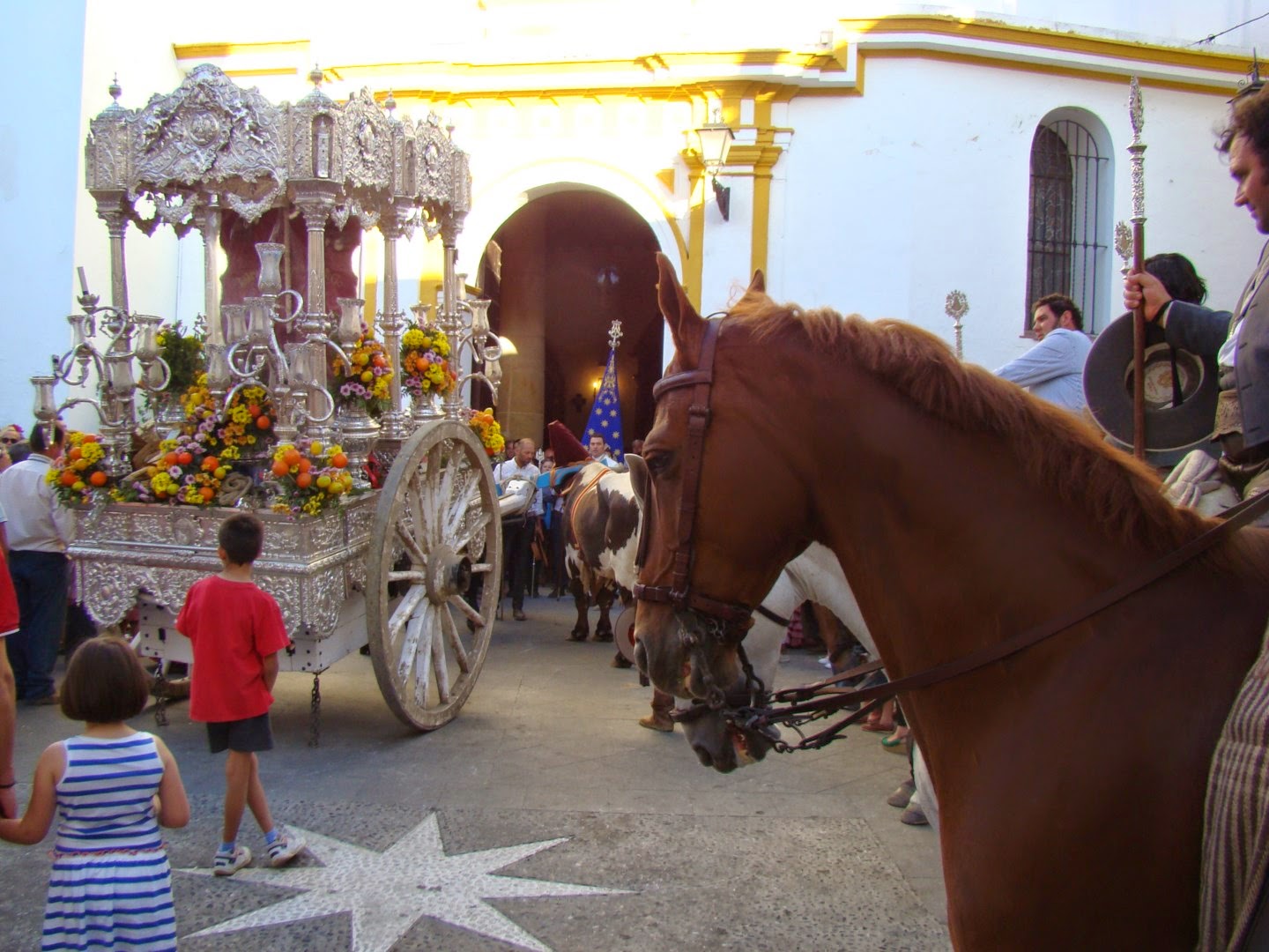 Lo más bonito es ver atravesar las diversas carretas del Simpecado de cada una de las Hermandades rocieras que tienen que pasar por ese lugar. Después recorren las calles del pueblo haciendo visita en la parroquia de Nª Sª de la Estrella siendo recibidos por la Hermandad de la patrona de la localidad. Les mostramos el paso de la Hermandad de Écija, en la que destaca su carreta del Simpecado con las torres de la ciudad labradas en plata.