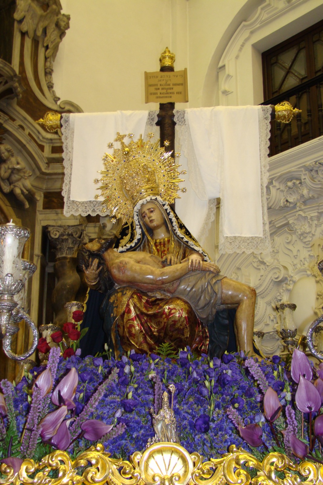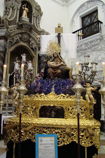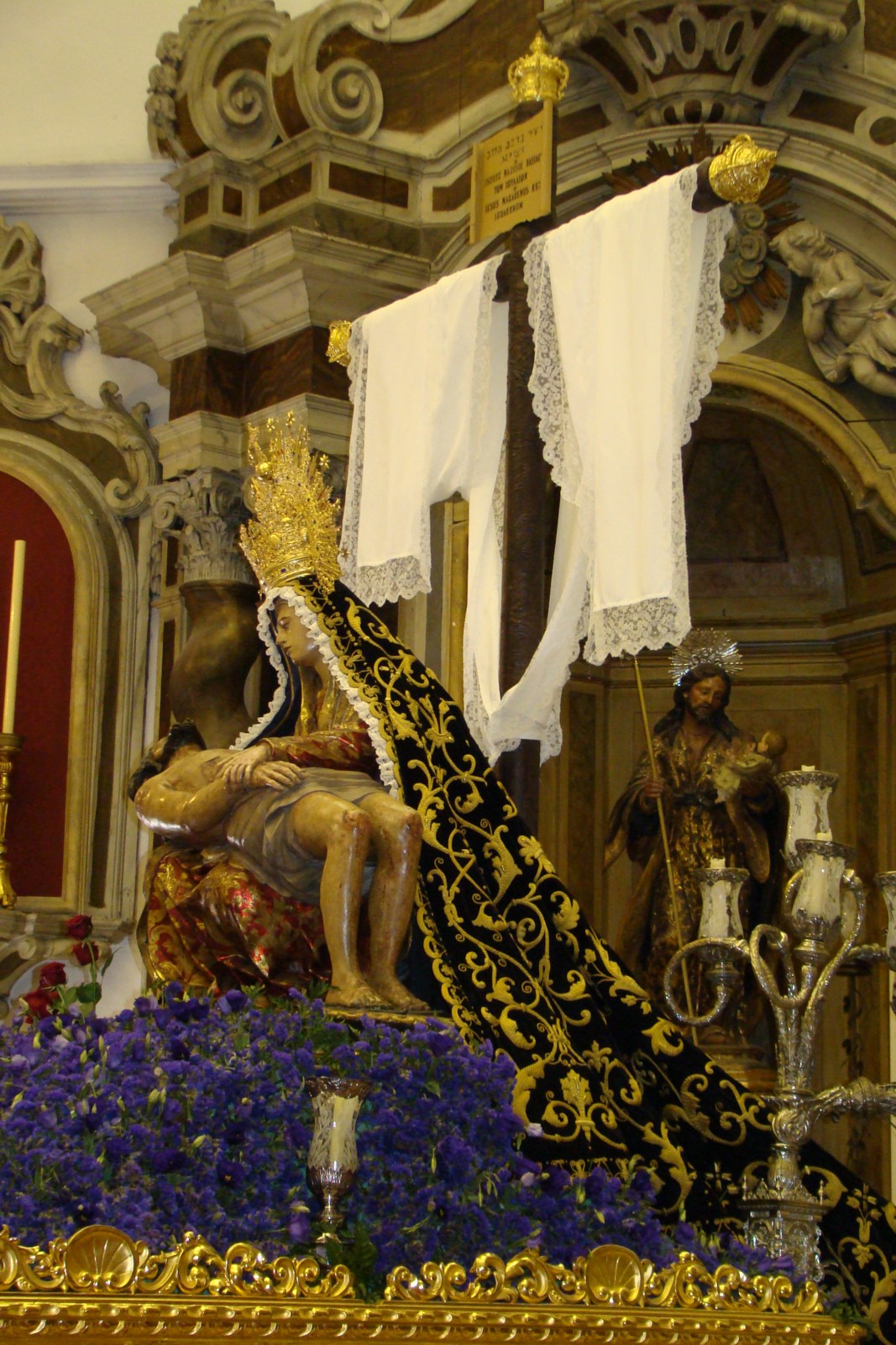 » El conjunto escultórico se atribuye a Marcelino Roldán o a su hijo Diego, realizado a finales del siglo XVII. El paso fue tallado en 1945 por Vera Espinosa, las pinturas que completan el canasto representan los Siete Dolores de la Virgen y fueron pintados por Rafael del Águila. El manto de la virgen realizado en 1958 por el taller del Colegio San Martín de la ciudad gaditana. Este paso procesiona anualmente en la jornada del miércoles santo, conocido popularmente por «el caminito». Participó en la Procesión Magna de 2012.»