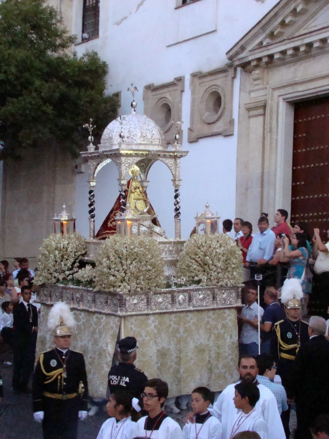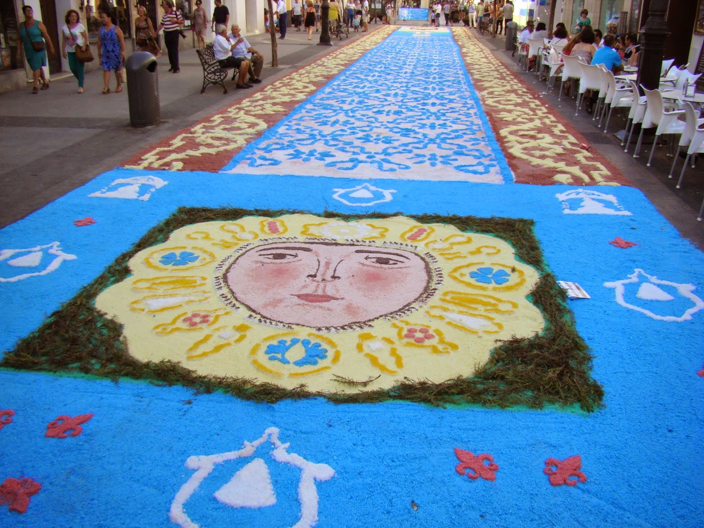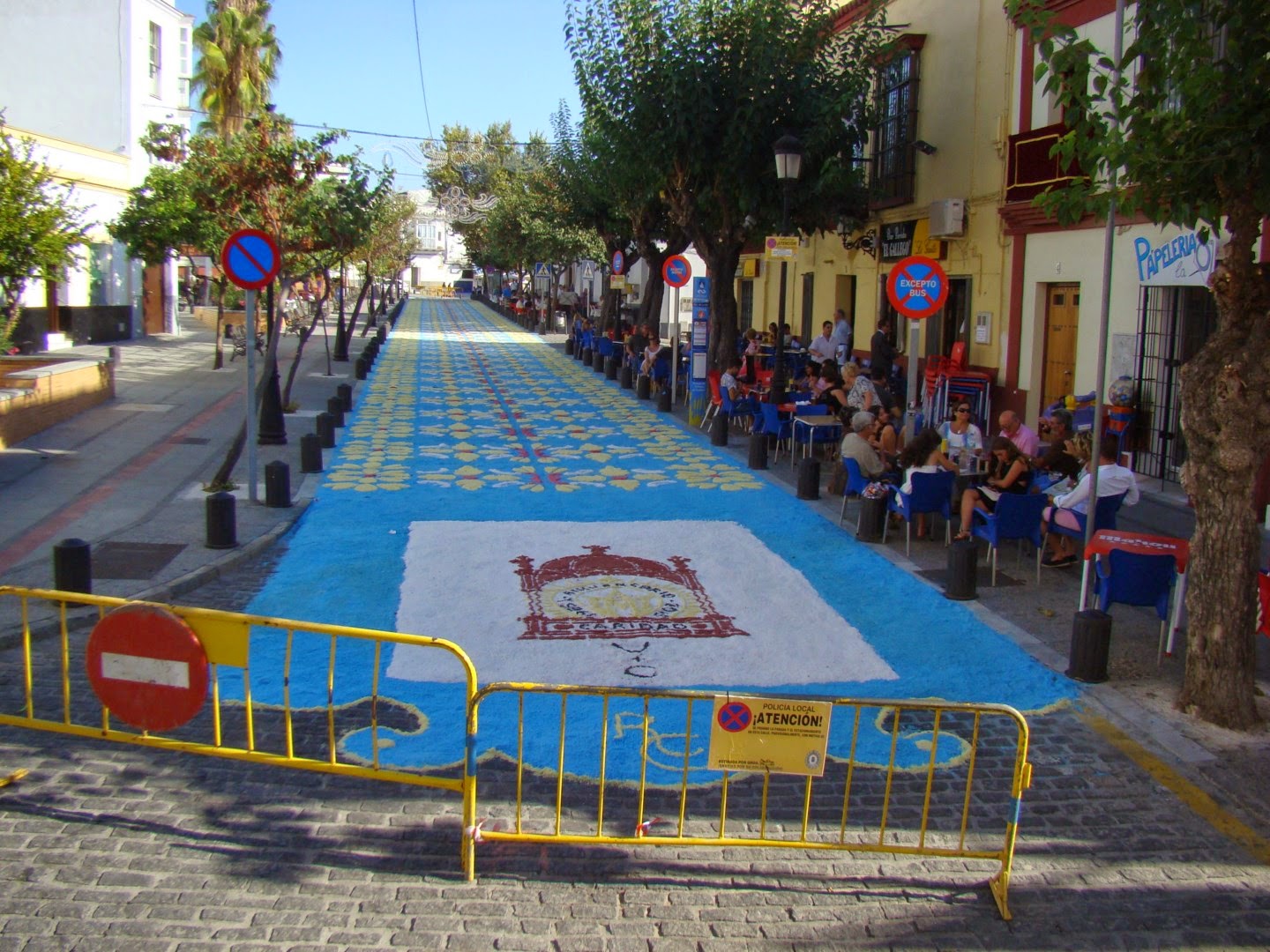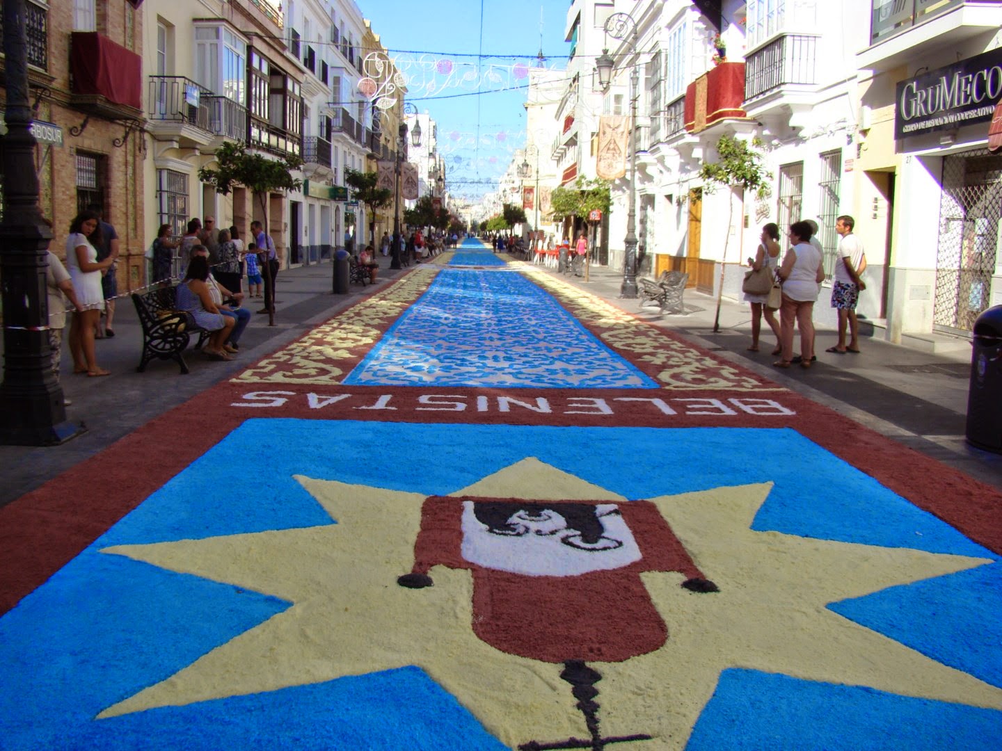 Como cada quince de agosto, festividad de la Asunción de la Virgen, la patrona de la localidad gaditana de Sanlúcar de Barrameda, Nª. Sª. de la Caridad Coronada salió en procesión gloriosa desde su basílica para recorrer las principales calles de la población. Como es tradición la Plaza de la Paz y la calle Ancha se encontraban adornadas con alfombras de sal coloreadas formando bellos y geométricos dibujos. Acompañaban al cortejo representaciones de todas las hermandades sanluqueñas. El acompañamiento musical tras el paso de la virgen lo hizo una vez más la banda local del maestro Julián Cerdán.