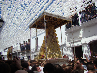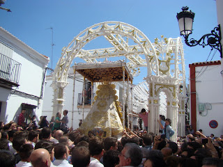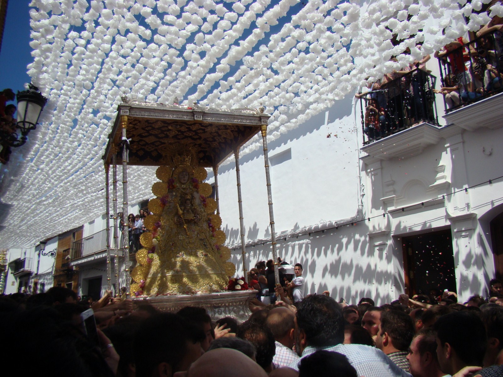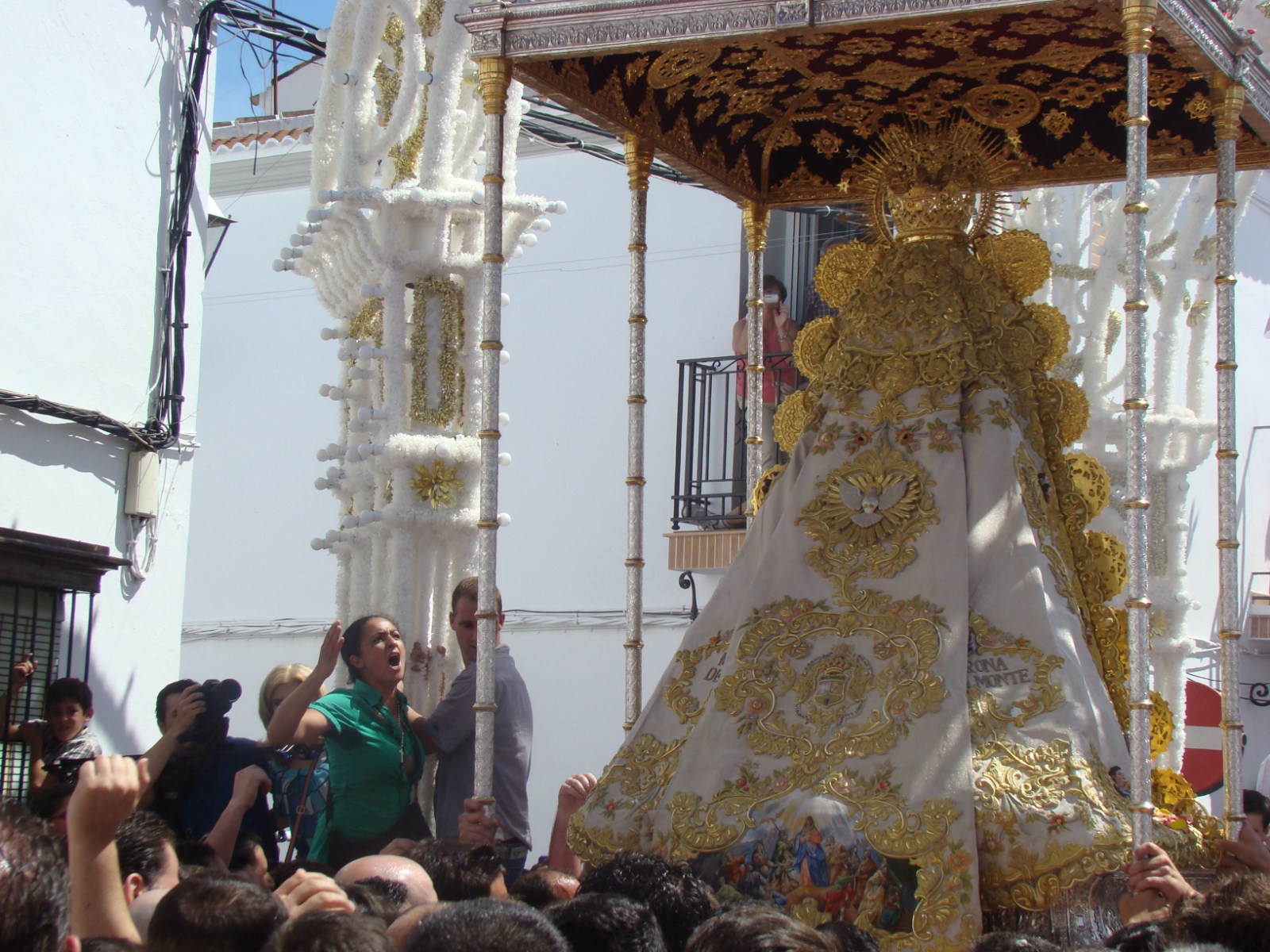 La imagen de Nª Sª del Rocío antes de ser trasladada a la aldea del rocío para la anual romería, realiza una procesión por la localidad de la que es patrona, Almonte. Esto ocurre cada siete años, en cumplimiento del voto hecho por la población en tiempos de la invasión napoleónica. Las calles de Almonte son bellamente engalanadas con arcos decorados con flores de papel y los vecinos al paso de la Virgen lanzan disparos de salva con sus escopetas. La Virgen lucía el último manto estrenado , el realizado en los talleres Santa Bárbara de Sevilla en 2011, denominado de “Pentecostés” y que estuvo expuesto en la exposición del Círculo Mercantil sevillano la pasada cuaresma.