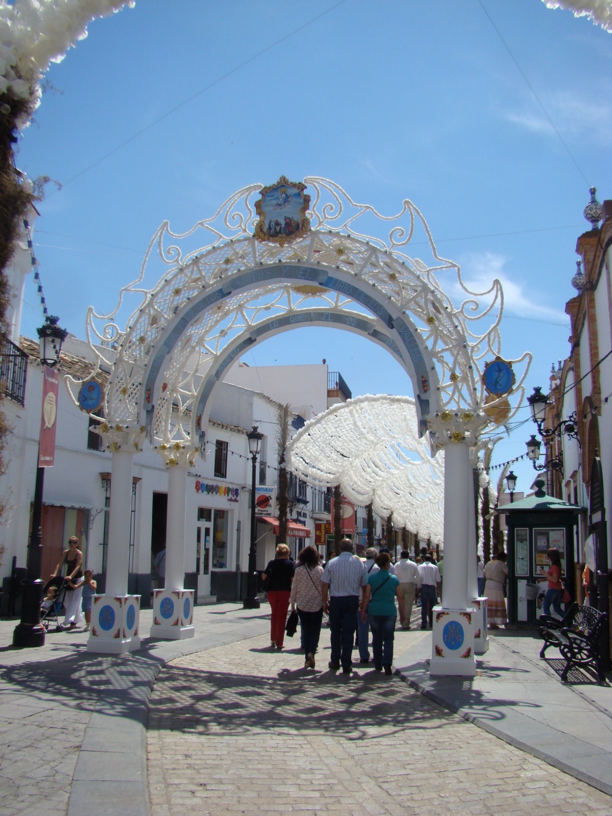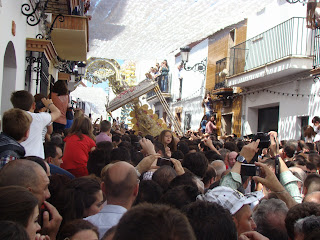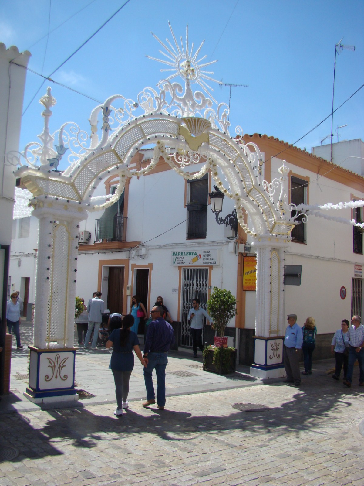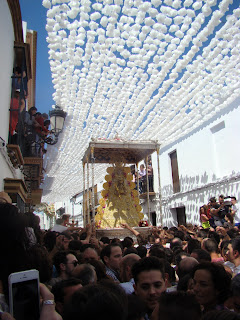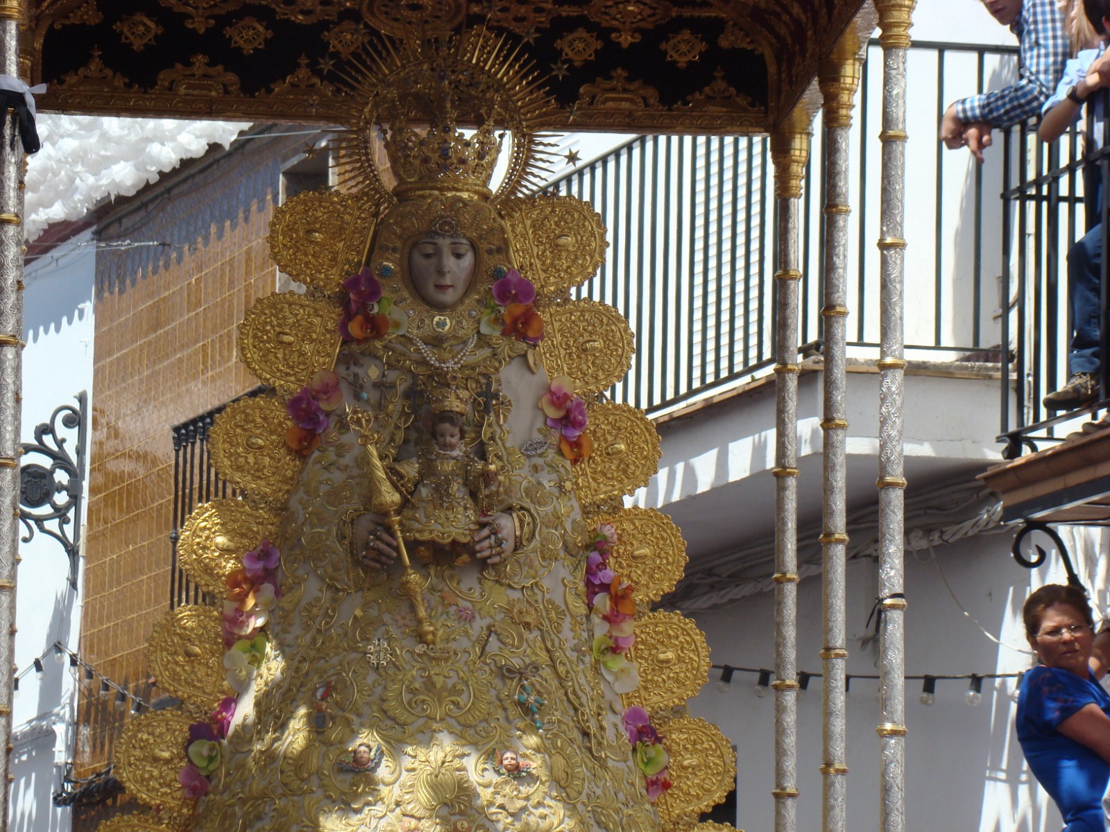La imagen de Nª Sª del Rocío antes de ser trasladada a la aldea del rocío para la anual romería, realiza una procesión por la localidad de la que es patrona, Almonte. Esto ocurre cada siete años, en cumplimiento del voto hecho por la población en tiempos de la invasión napoleónica. Las calles de Almonte son bellamente engalanadas con arcos decorados con flores de papel y los vecinos al paso de la Virgen lanzan disparos de salva con sus escopetas. La Virgen lucía el último manto estrenado , el realizado en los talleres Santa Bárbara de Sevilla en 2011, denominado de “Pentecostés” y que estuvo expuesto en la exposición del Círculo Mercantil sevillano la pasada cuaresma.