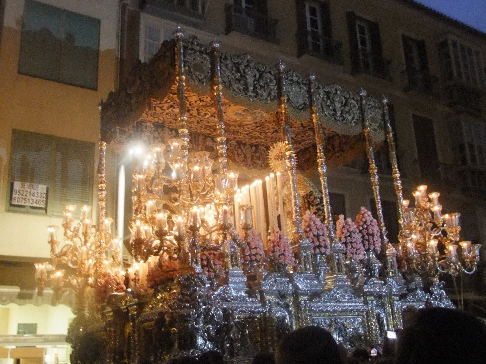 Durante todo el sábado pudimos acompañar a la bella Dolorosa de Asensio por distintos enclaves, en distintos tronos y con diverso acompañamiento musical. Por la mañana se trató de una comitiva más cofrade, más de la hermandad, con el rezo del Santo Rosario y los sones de una capilla musical. Por la tarde-noche fue el apoteósis de una procesión gloriosa y multitudinaria, más aún con el valor añadido de la suspensión por lluvia del pasado Miércoles Santo. Cofrades de toda Andalucía se dieron cita en Málaga para disfrutar del trono con mayúsculas, del genuino trono malagueño de Virgen en metal plateado, con un inmenso manto, cuatro arbotantes y una peculiar disposición de las barras de palio y una ubicación atrasada de la Señora. Sin dudas una jornada para el recuerdo, y en especial el paso por calle Ancha y la visita al templo carmelita donde la dolorosa perchelera fue saludada por la Virgen del Carmen.