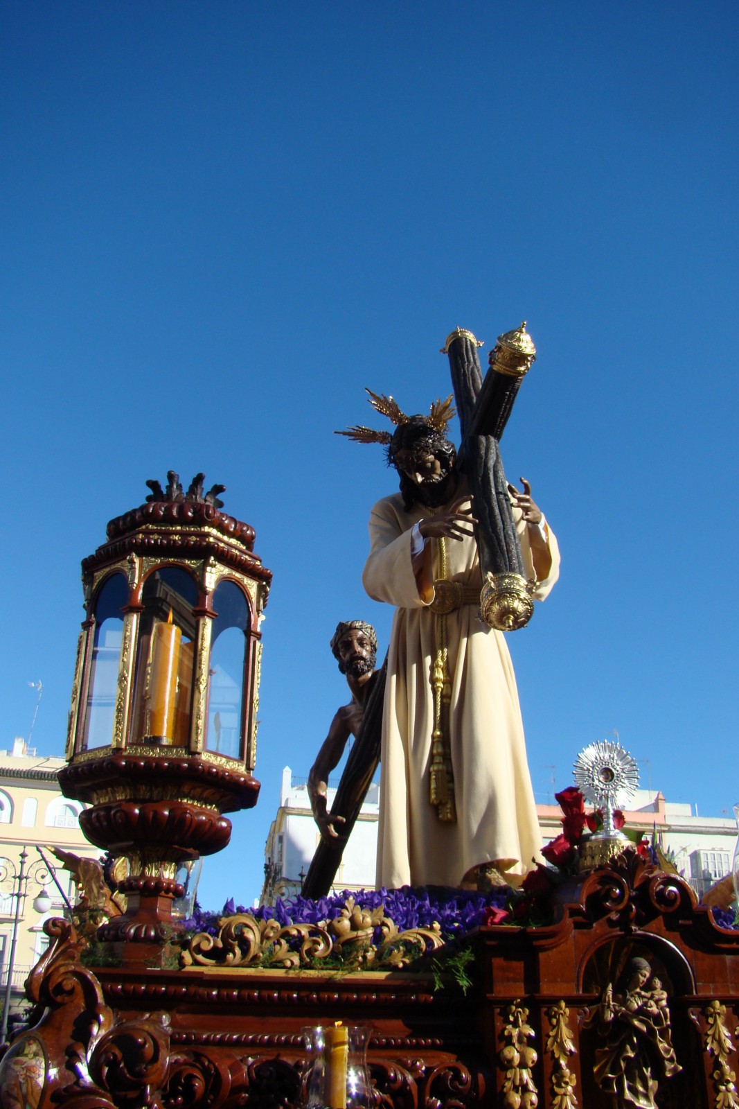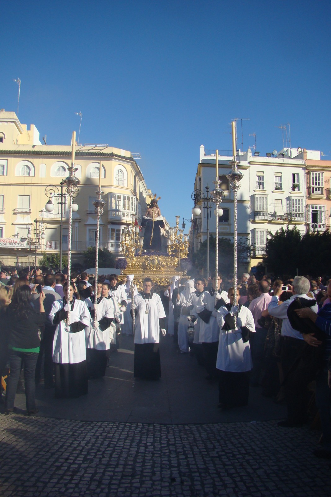 » La ciudad de Cádiz que en este año se encuentra conmemorando el Bicentenario de «La Pepa», decidió incluir durante la Semana Santa de 2012 una Procesión Magna el Sábado Santo para realzar los fastos de dicha efemérides. La Procesión contó con la presencia de 20 pasos que precedían en orden cronológico de la pasión de Cristo al cortejo de la Hermandad del Santo Entierro. El centro de la ciudad y en especial las calles que formaban parte del itinerario de la carrera oficial, se encontraban abarrotadas de público deseoso de ver una procesión que hacia más de treinta años no se organizaba en Cádiz. Por la mañana temprano salieron los pasos desde sus respectivas iglesias con dirección a la Catedral donde las colas para verlos fueron enormes, a las 15,30 se inicio la procesión desde la sede catedralicia hasta la Plaza de San Antonio donde finalizaba la carrera oficial, desde ese lugar las cofradías regresaban a sus sedes canónicas. Les mostramos en este reportaje el discurrir de los pasos por la Plaza de San Antonio en el mismo orden en el que desfilaron.»