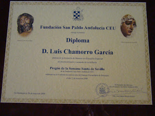 El día 28 de mayo de 2008 se realizó en la Universidad San Pablo-CEU el acto de clausura del presente curso 2007/2008, durante la cual nuestro hermano D. Luís Chamorro García fué objeto de un emotivo reconocimiento por la realización del Pregón de la Semana Santa de dicha institución. La entrega de la distinción corrió a cargo de nuestro cardenal Monseñor Fray Carlos Amigo Vallejo.