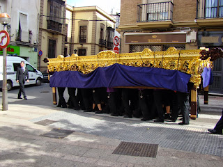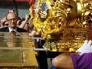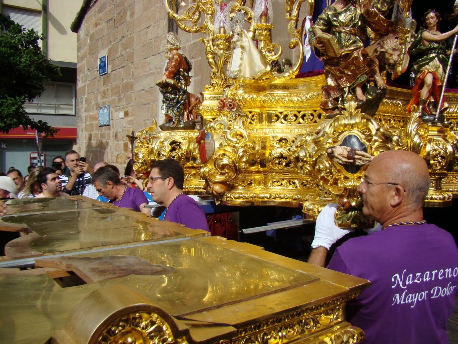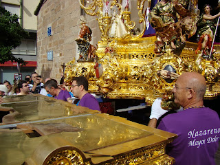 La imagen de Nº Padre Jesús Nazareno de la localidad jiennense de Linares salió el pasado sábado 12 de octubre con motivo de la celebración de la Procesión “Regina Fides” por el “Año de la Fe”. Nos llamó poderosamente la atención la salida del paso de Jesús, ya que debido a las reducidas dimensiones de la puerta de la iglesia de San Francisco, la labor de sacar la imagen es una verdadera obra de ingeniería. Les mostramos paso a paso los diferentes momentos de la salida, desde la llegada de la parihuela con los respiraderos, que es recibido a sones de trompeta, el montaje de la plataforma con los carriles para que pueda deslizarse la canastilla y la colocación del canasto sobre la parihuela. Por último el resultado final, viendo el paso en la calle nadie diría que es de dos piezas.