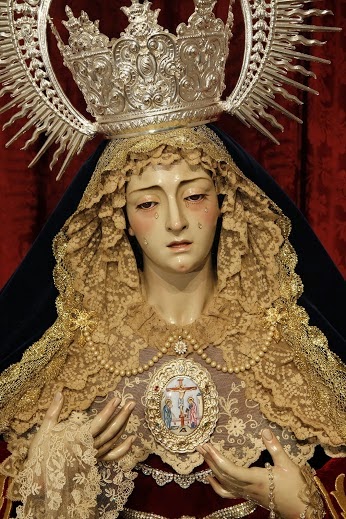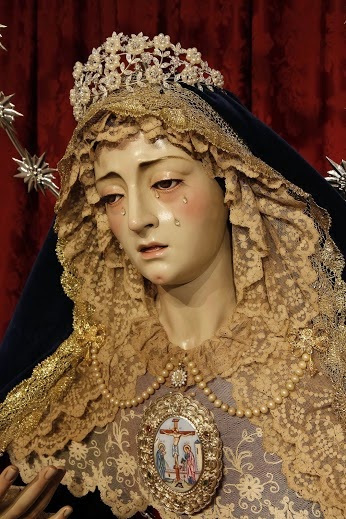 Precisamente sus ojos son uno de los elementos que caracterizarán a la Dolorosa ya que su baja mirada los muestra especialmente entornados dejando ver sus párpados, lo que le otorga al rostro una sensación de tristeza, agotamiento y extenuación ante el profundo dolor de la muerte de su Hijo. Aún así, se mantiene en pie, soportando el dolor que se ve subrayado por las largas y finas cejas levísimamente onduladas, lo que hace fruncir ligeramente la frente en contraposición a la serenidad del entrecejo. De los ojos, con pestañas de pelo natural, manan las cinco lágrimas de cristal que corren por sus enrojecidas mejillas.