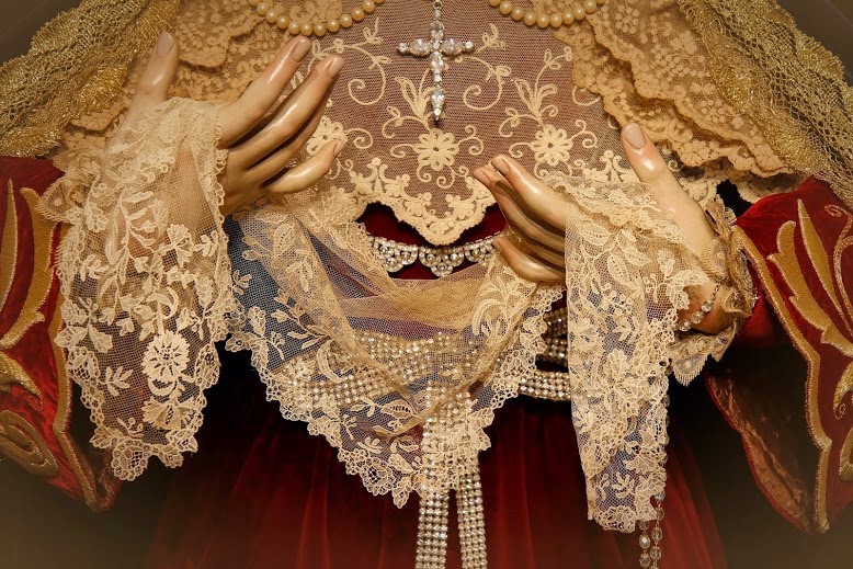 Las manos, abiertas ante su regazo, muestran dedos finos y estilizados que se van cerrando emotivamente para acoger el pañuelo, despegándose los meñiques para aumentar su expresividad, contribuyendo a la expresividad del conjunto.