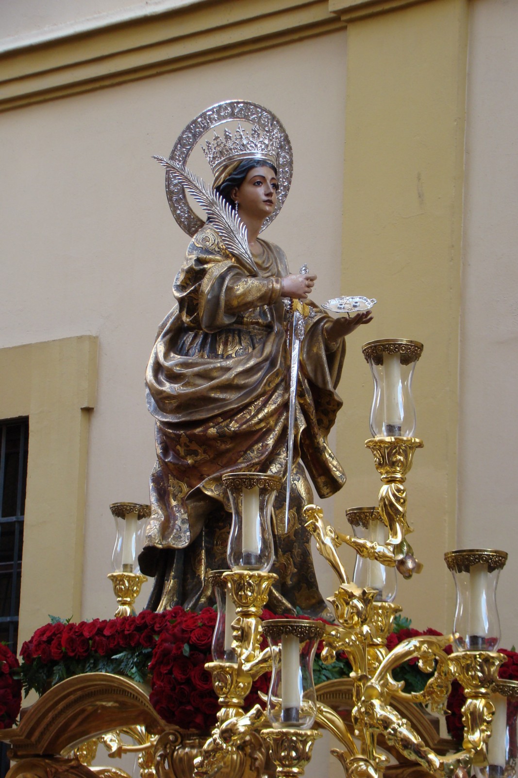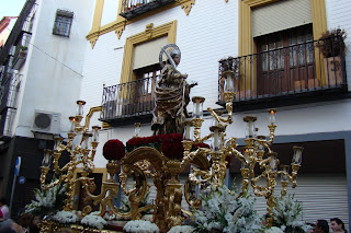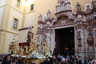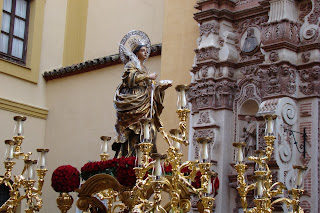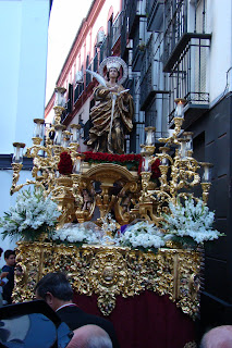 » El primer fin de semana de Mayo se ha realizado en la Catedral de Sevilla el Pregón de las Glorias, cada año una imagen letífica es designada por el Consejo de Hermandades y Cofradías para presidir el mismo.En esta edición la designación recayó en la imagen de Santa Lucía que actualmente tiene como sede provisional la iglesia de San Román, desde dicho templo partió el viernes en procesión hacia la Catedral sevillana para regresar el domingo. Les mostramos diversas instantáneas de la procesión de ida donde en el cuerpo de acólitos participaban algunas caras conocidas pues son «hermanos de las Aguas».