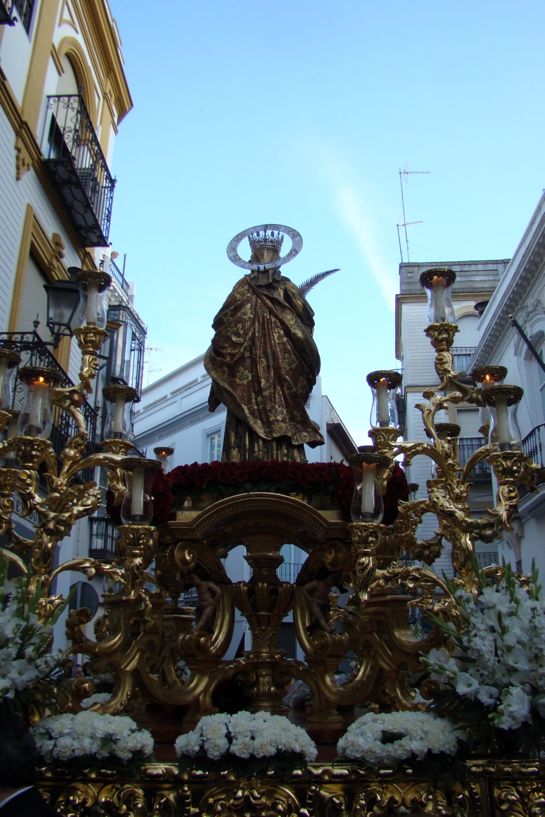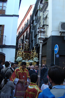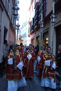 » El primer fin de semana de Mayo se ha realizado en la Catedral de Sevilla el Pregón de las Glorias, cada año una imagen letífica es designada por el Consejo de Hermandades y Cofradías para presidir el mismo.En esta edición la designación recayó en la imagen de Santa Lucía que actualmente tiene como sede provisional la iglesia de San Román, desde dicho templo partió el viernes en procesión hacia la Catedral sevillana para regresar el domingo. Les mostramos diversas instantáneas de la procesión de ida donde en el cuerpo de acólitos participaban algunas caras conocidas pues son «hermanos de las Aguas».