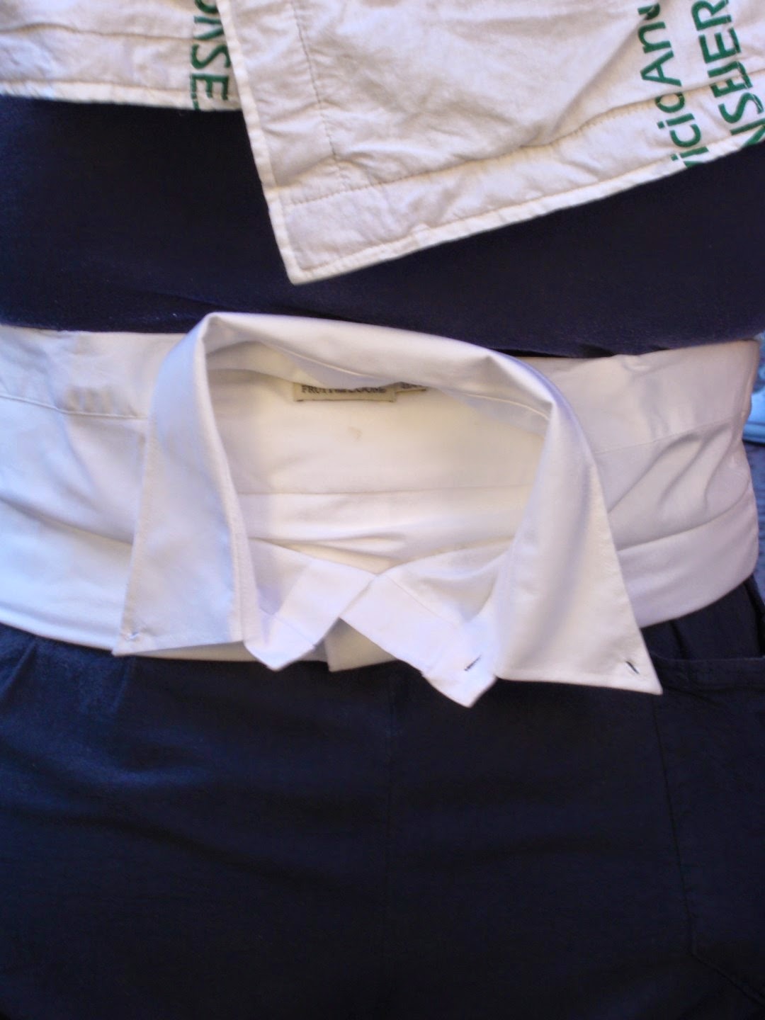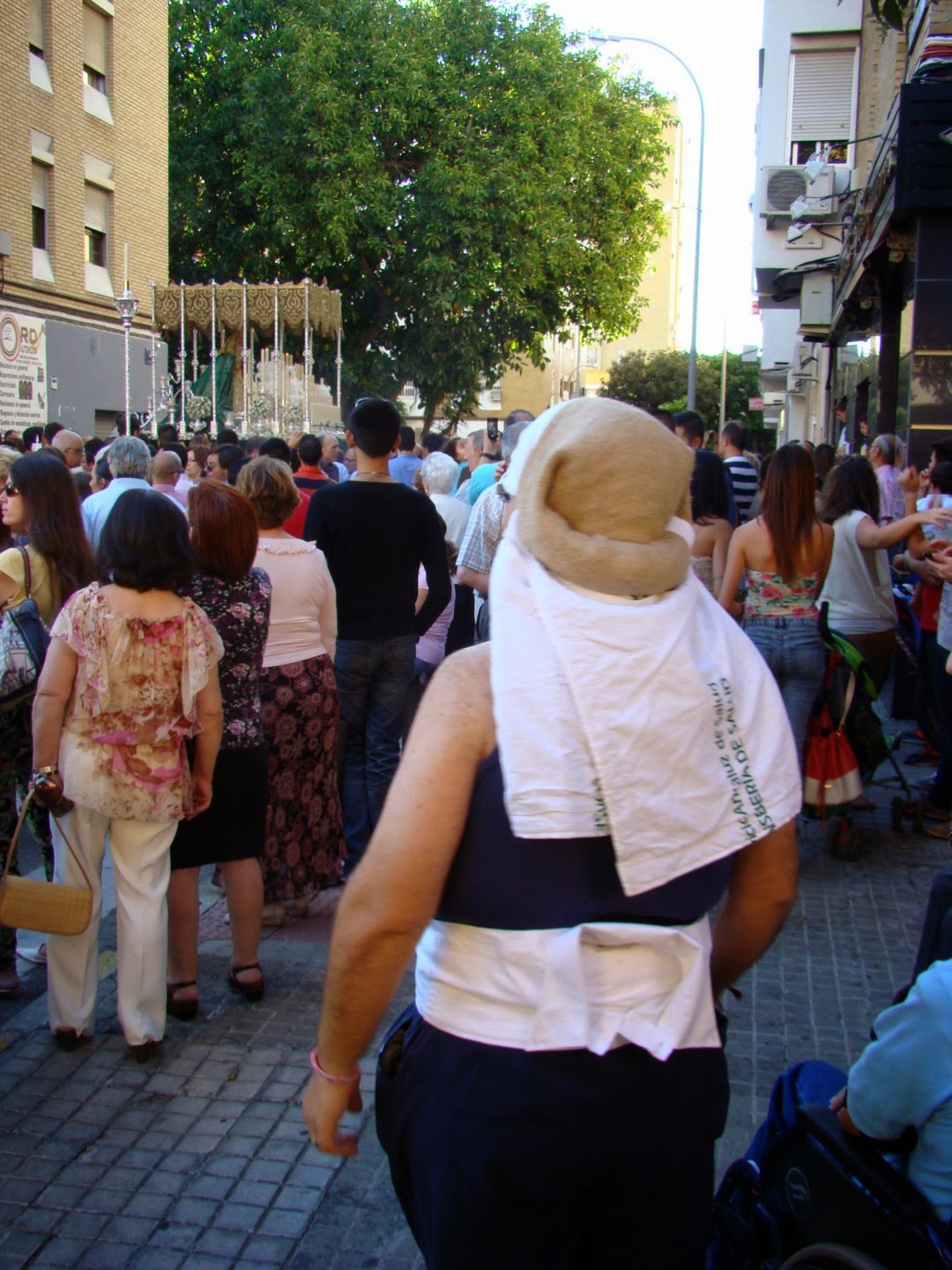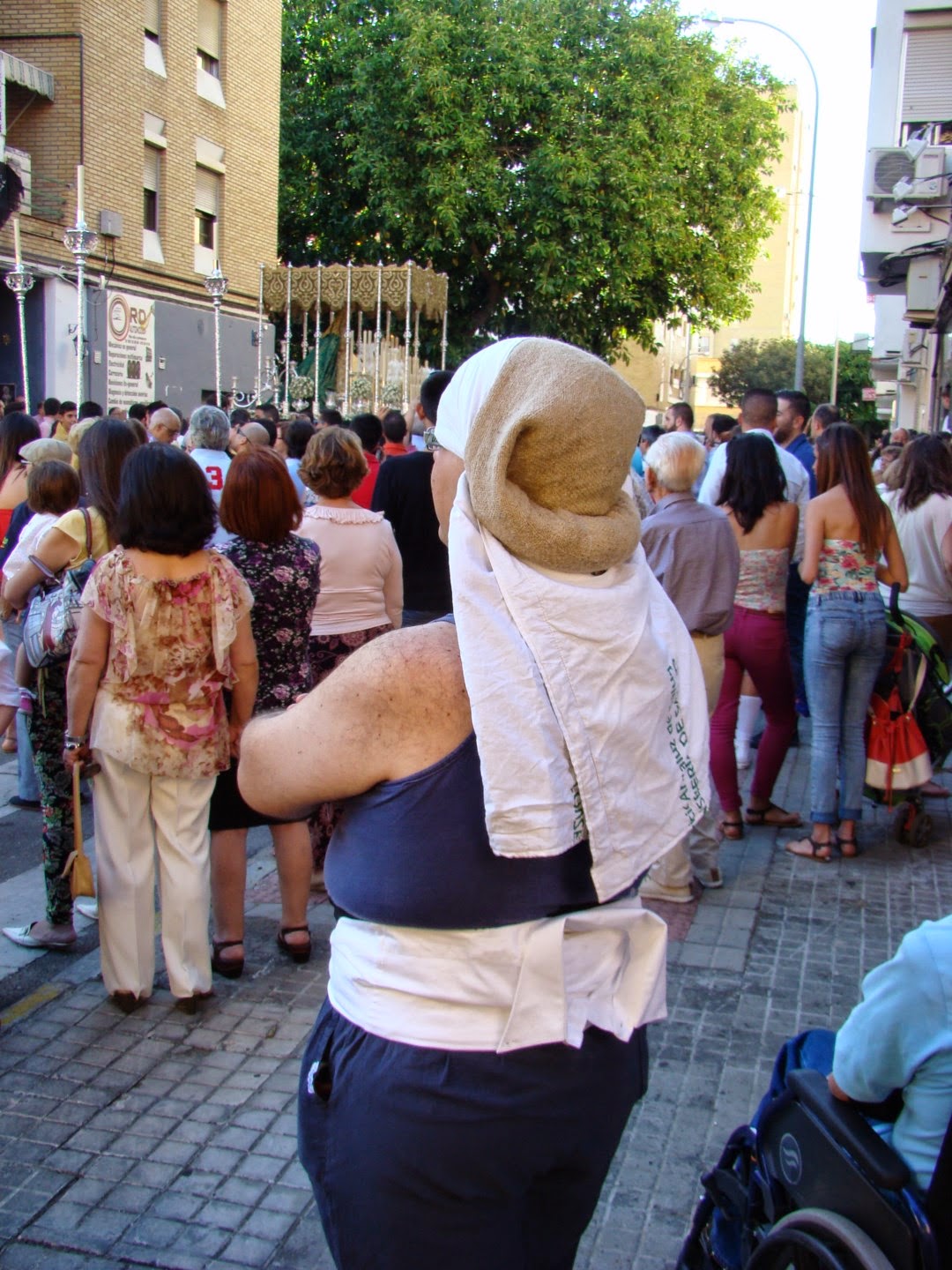 Los costaleros de Sevilla tienen la costumbre de llevar además de la faja , la camisa amarrada a la cintura. Mira que a lo largo de estos años hemos vistos costaleros, pero nunca nos habíamos encontrado uno de esta guisa, podíamos definirlo como “curioso o detallista” por lo bien dobladita que lleva la camisa. Ver para creer.