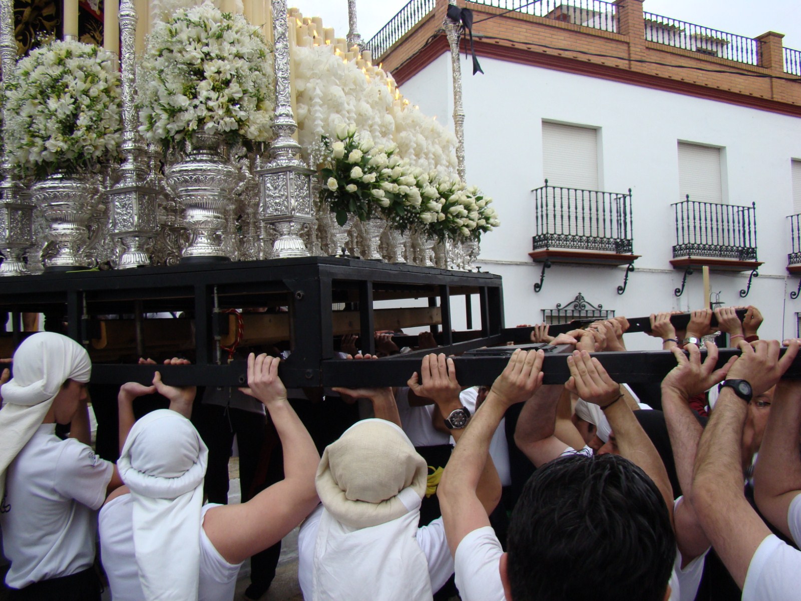 En la localidad de Huevar del Aljarafe el sábado santo sale en procesión la Hermandad de la Soledad desde su sede canónica, la iglesia parroquial de Nª Sª de la Asunción, un templo gótico mudéjar que como puede observarse en las imágenes tiene una puerta ojival de reducidas dimensiones. El ingenio de los cofrades ha permitido resolver el problema del reducido espacio de la puerta, que para mayor dificultad posee unos escalones delante.