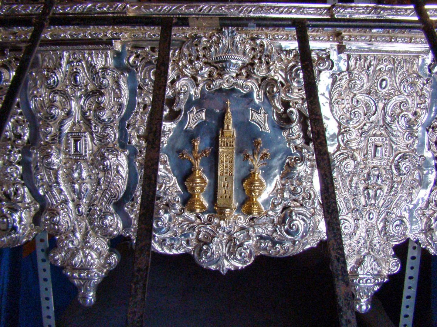 El paso de palio de Mª Santísima de Guadalupe tiene en su parte trasera una particularidad que lo hace ser diferente a todos los demás palios de Sevilla. Esta singularidad tiene su origen cuando la parihuela del paso de palio era utilizada para la procesión de gloria de Nª Sª del Rosario, en aquel entonces se realizó una nueva delantera a juego con los respiraderos existentes, donde se colocó el escudo de la archidiócesis hispalense. Actualmente esa pieza figura en la trasera del palio y queda ocultada por el manto.