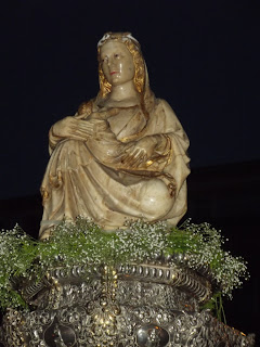 Quinto encuentro » Jesús nace en Belén», representado por la imagen de Nª Sª de Consolación. Talla en alabastro, anónima del siglo XV. Al ser la patrona de los abogados, iba una representación de los mismos con toga.