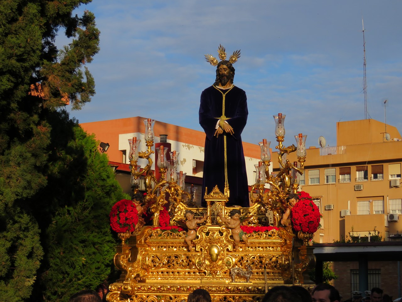 La Agrupación cofrade sale desde una carpa montada en la plaza de Pio XII con el acompañamiento musical de la Agrupación Musical Nº. P. Jesús Nazareno de La Algaba.