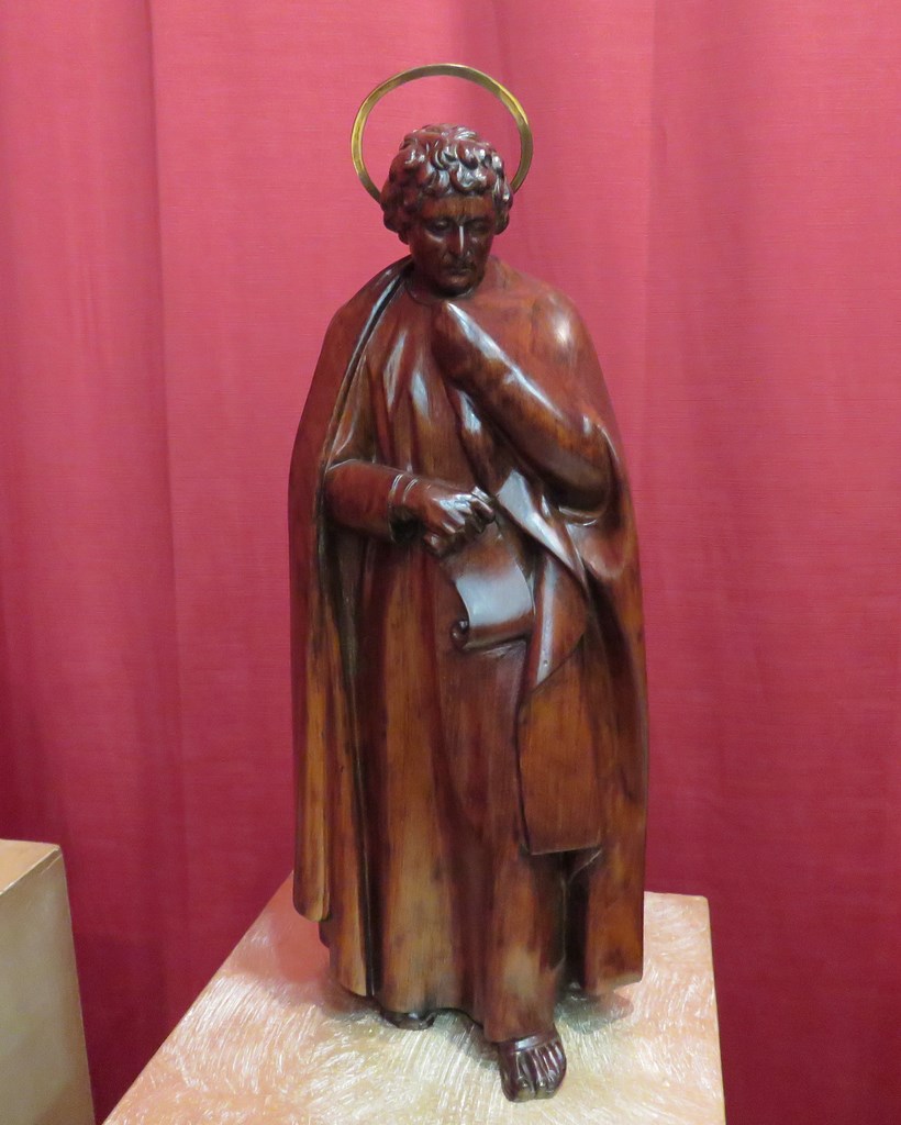 Los evangelistas de las esquinas del paso del Cristo de la Buena Muerte de la Hermandad de los Estudiantes, realizados en madera de caoba por Antonio Bidón en 1931.
