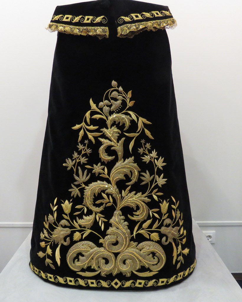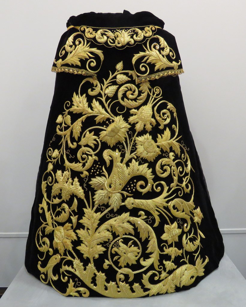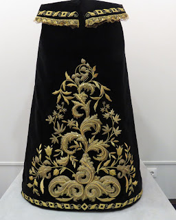 La saya en terciopelo negro de la Hermandad de las Cigarreras realizada por Emilia Salvador Ybarra en 1887 para la Virgen de la Victoria.